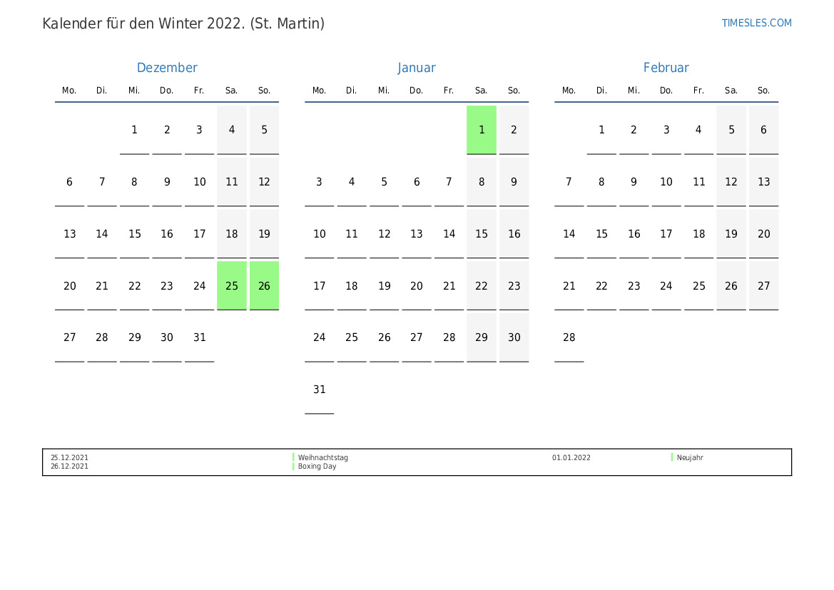Kalender der Feiertage und Wochenenden für den Winter 2022 für Sint Maarten