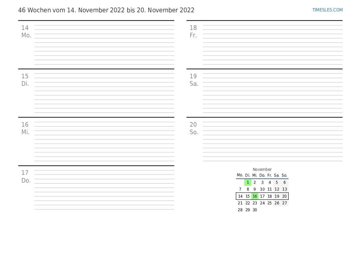 Laden Sie den PDF-Kalender wöchentlich für die 46. Woche 2022 vom 14. November 2022 bis 20. November 2022 herunter und drucken Sie ihn aus