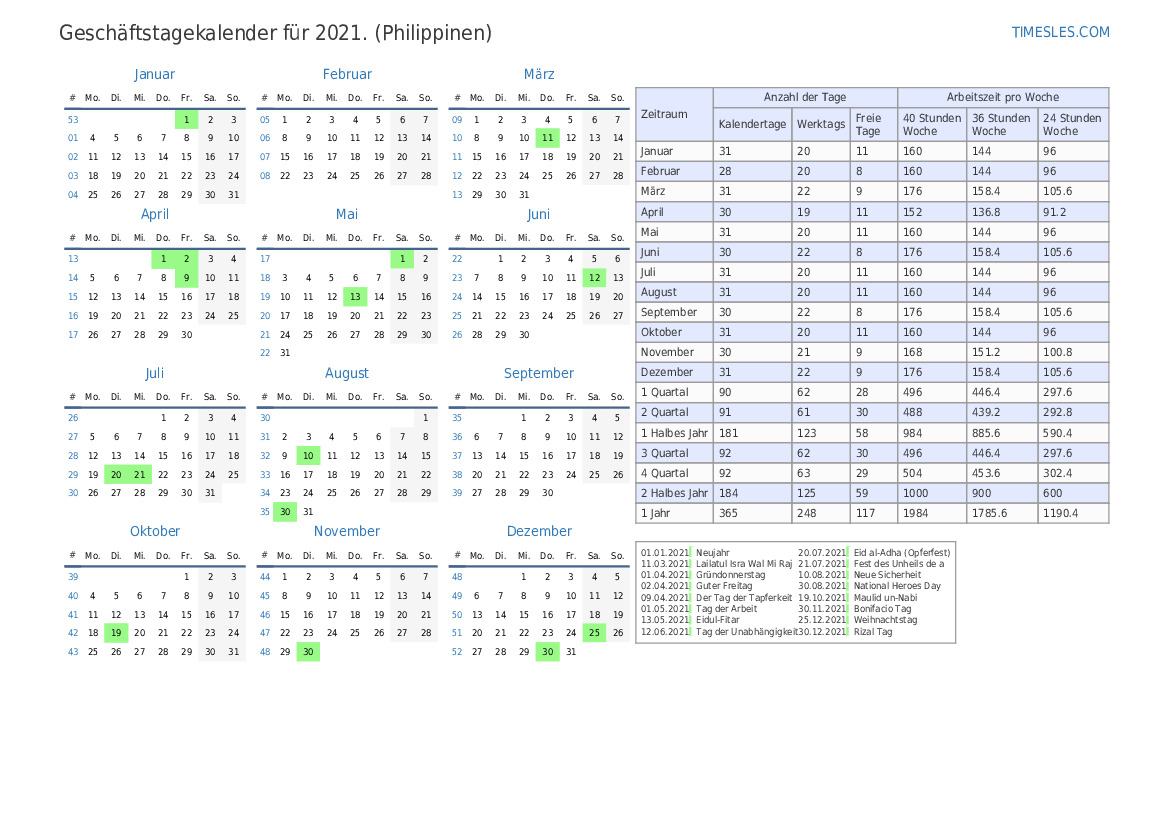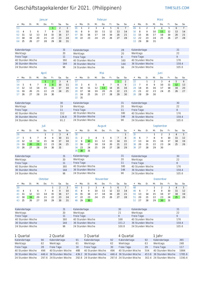 Arbeitstage für April 2021. Für April 2021 gibt es auf den Philippinen 4 Feiertage und freie Tage.