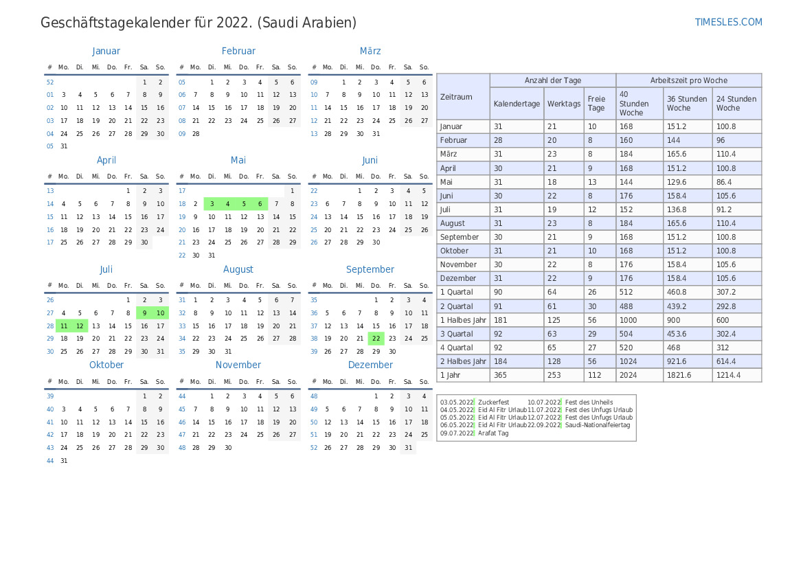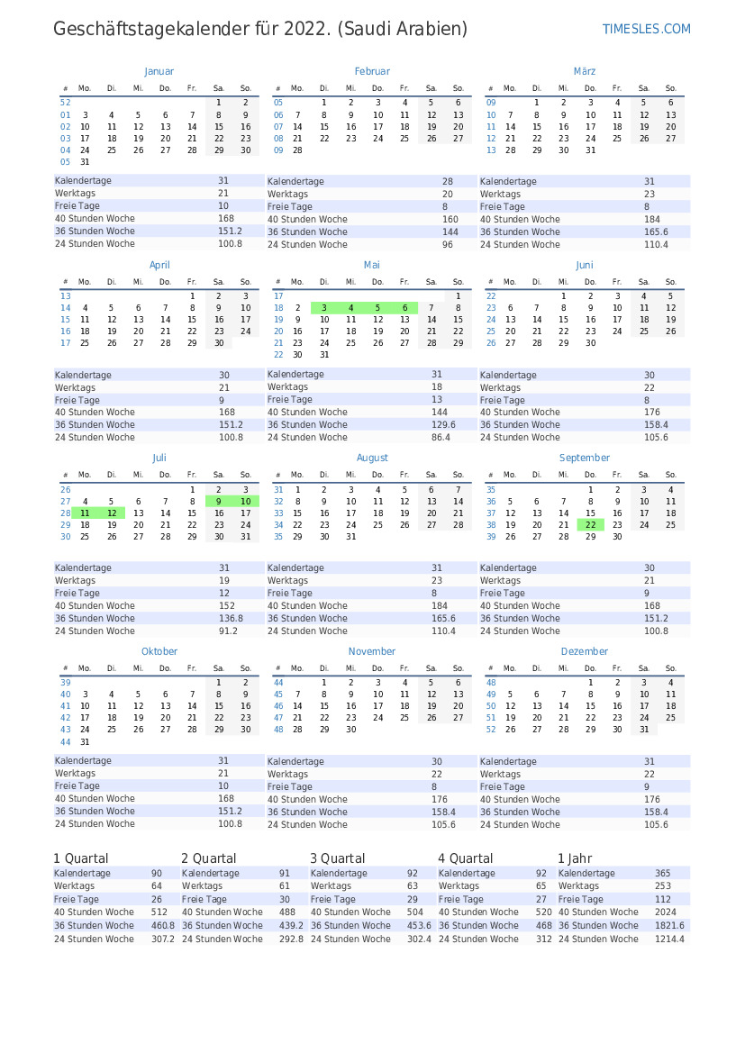 Laden Sie den PDF-Arbeitstagskalender für November 2022 für Saudi-Arabien herunter und drucken Sie ihn aus