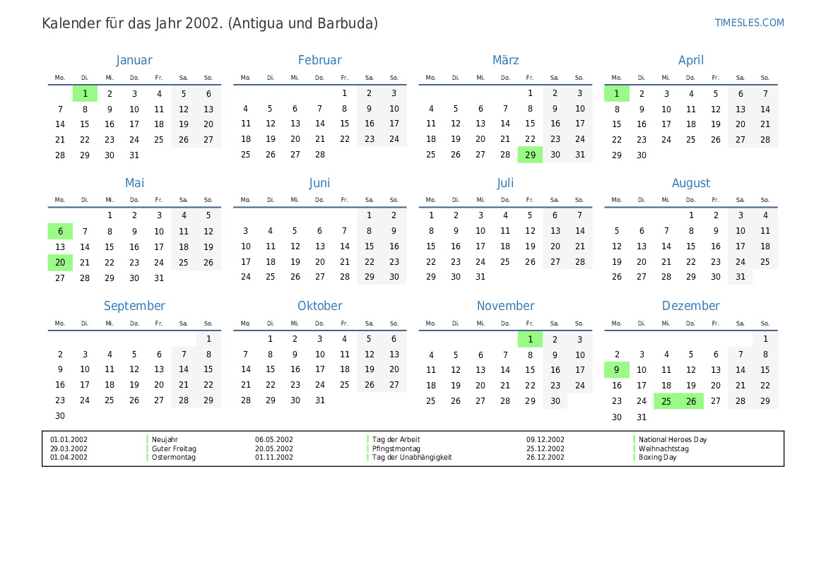 Gregorianisch, kein Schaltjahr, 365 Tage im Jahr. Im Jahr 2002 gibt es in Antigua und Barbuda 13 Feiertage und freie Tage. Im ostchinesischen Kalender ist 2002 das Jahr des Pferdes. Das Jahr beginnt am Dienstag und endet am Dienstag.
