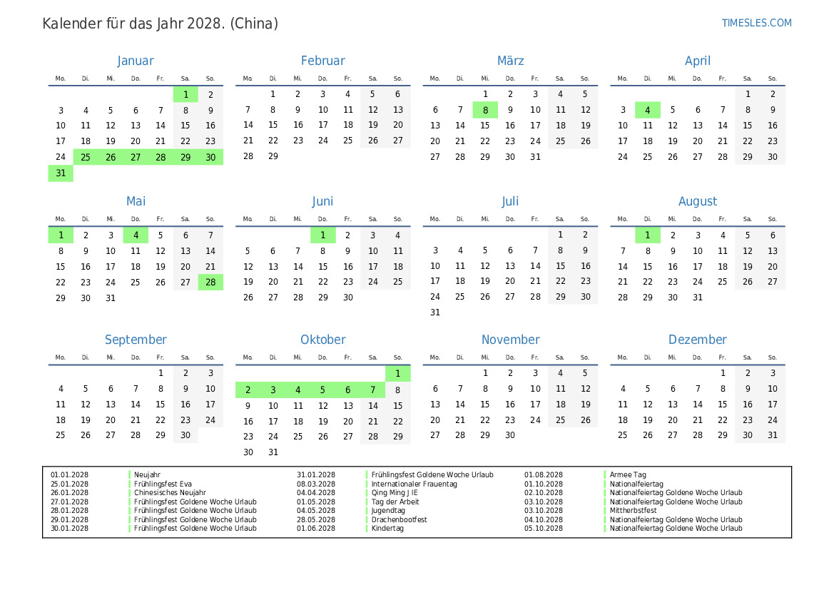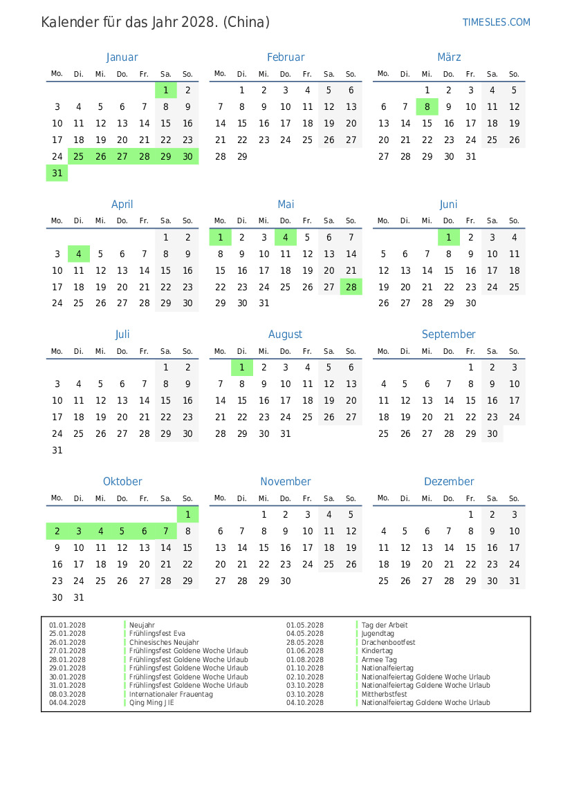 28.01.2028 Frühlingsfest Goldene Woche Urlaub