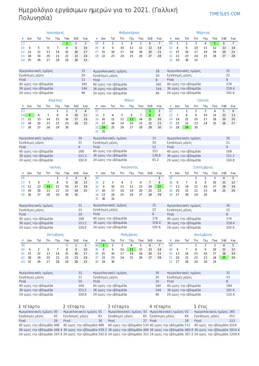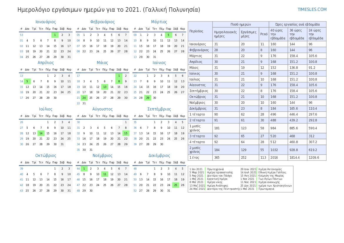 Ημερολόγιο Απρίλιος 2021 εργάσιμων ημερών για τη Γαλλική Πολυνησία