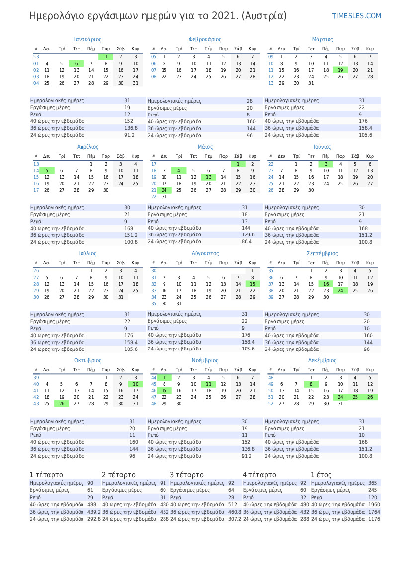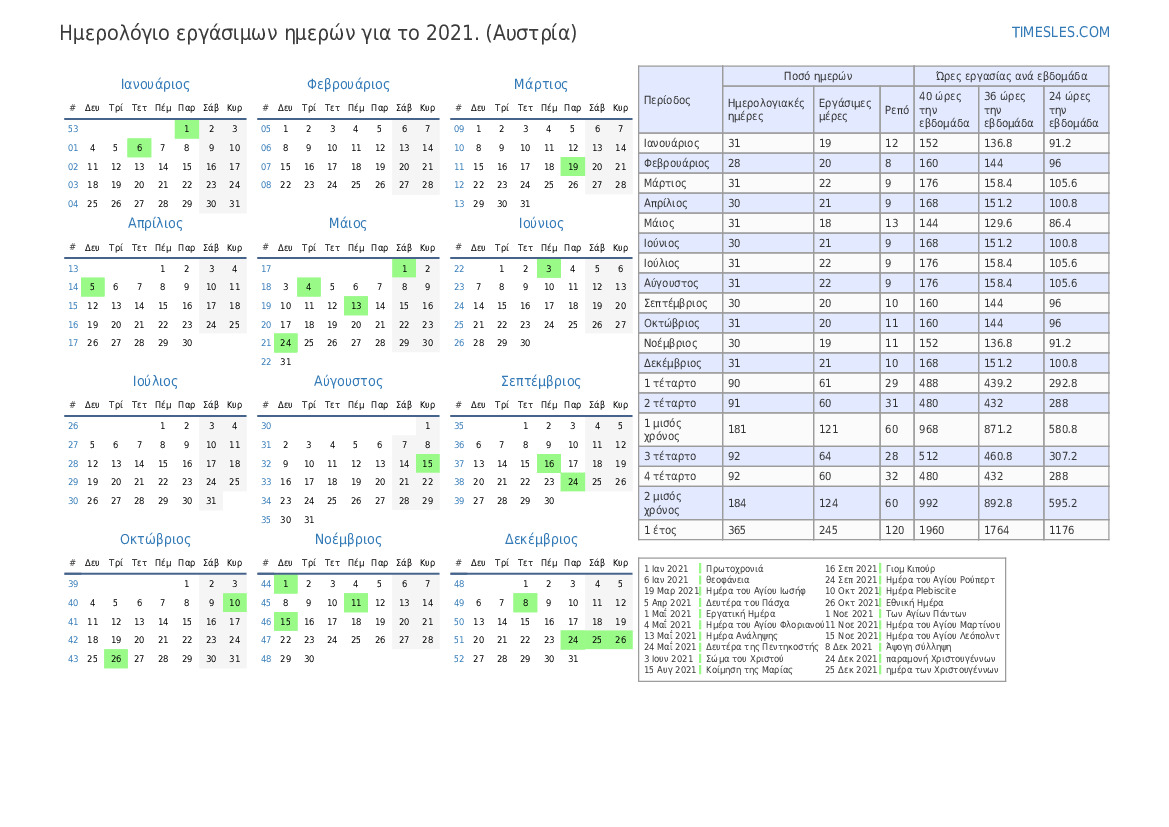 Ημερολόγιο εργάσιμων ημερών με αργίες και σαββατοκύριακα για το 1 τρίμηνο του 2021 για την Αυστρία