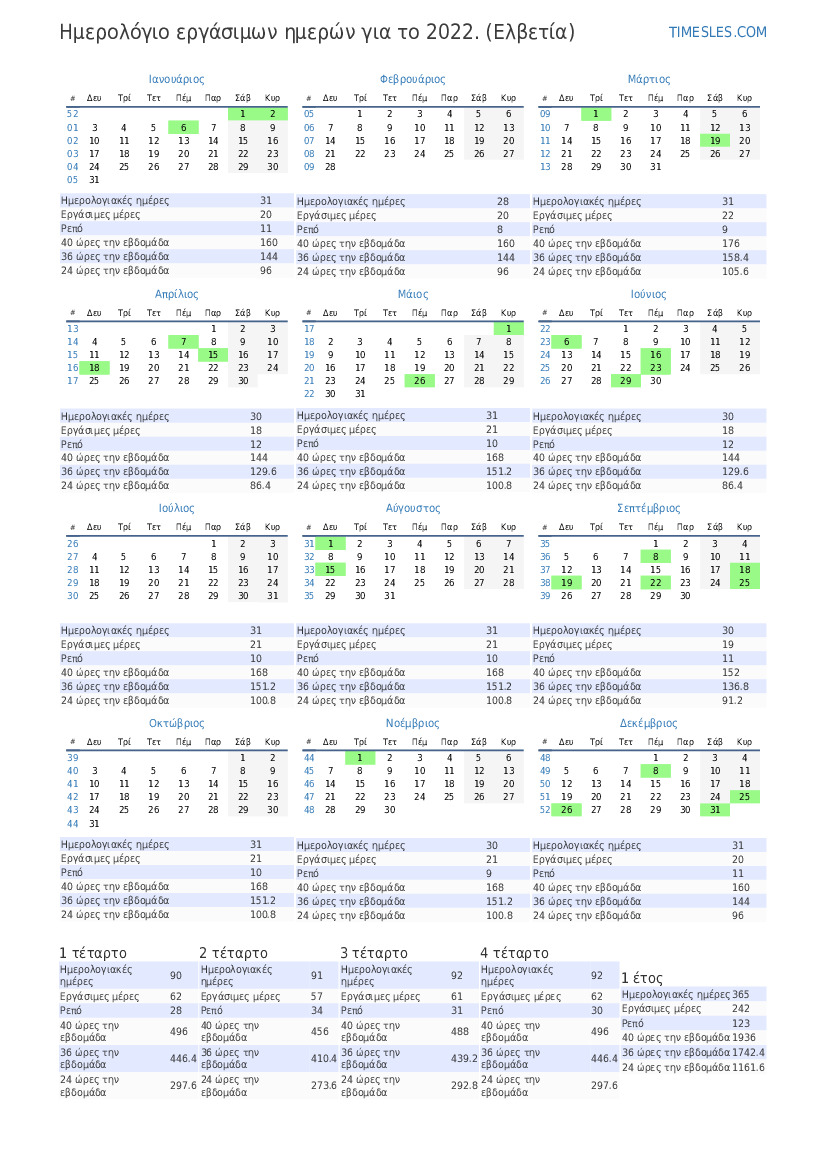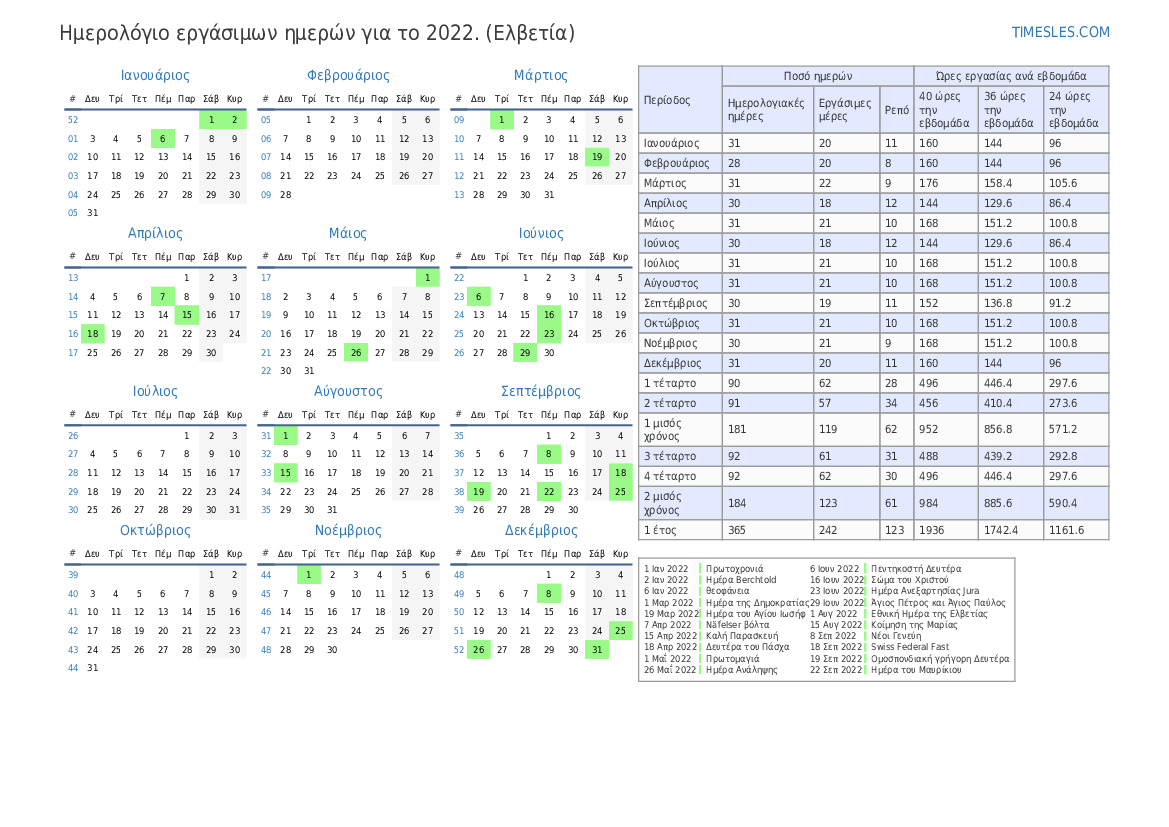 Ημερολόγιο εργάσιμων ημερών με αργίες και σαββατοκύριακα για το 2 τρίμηνο του 2022 για την Ελβετία