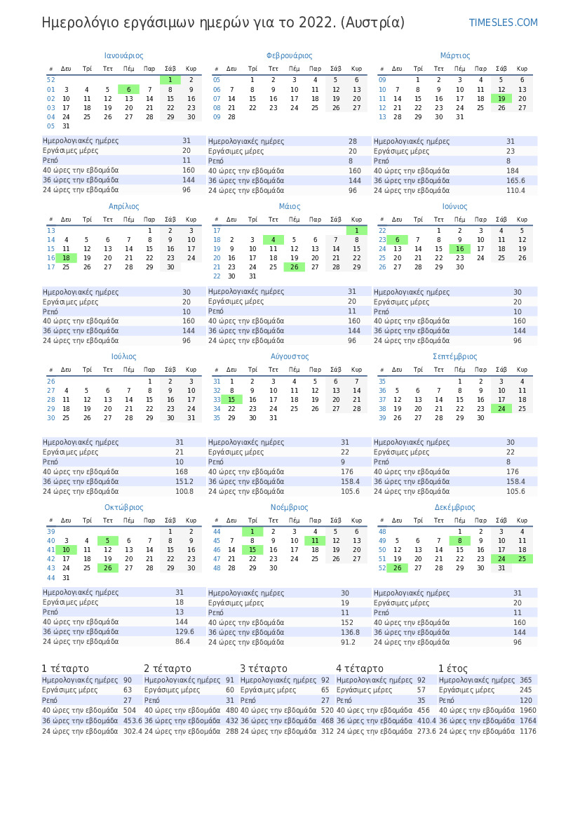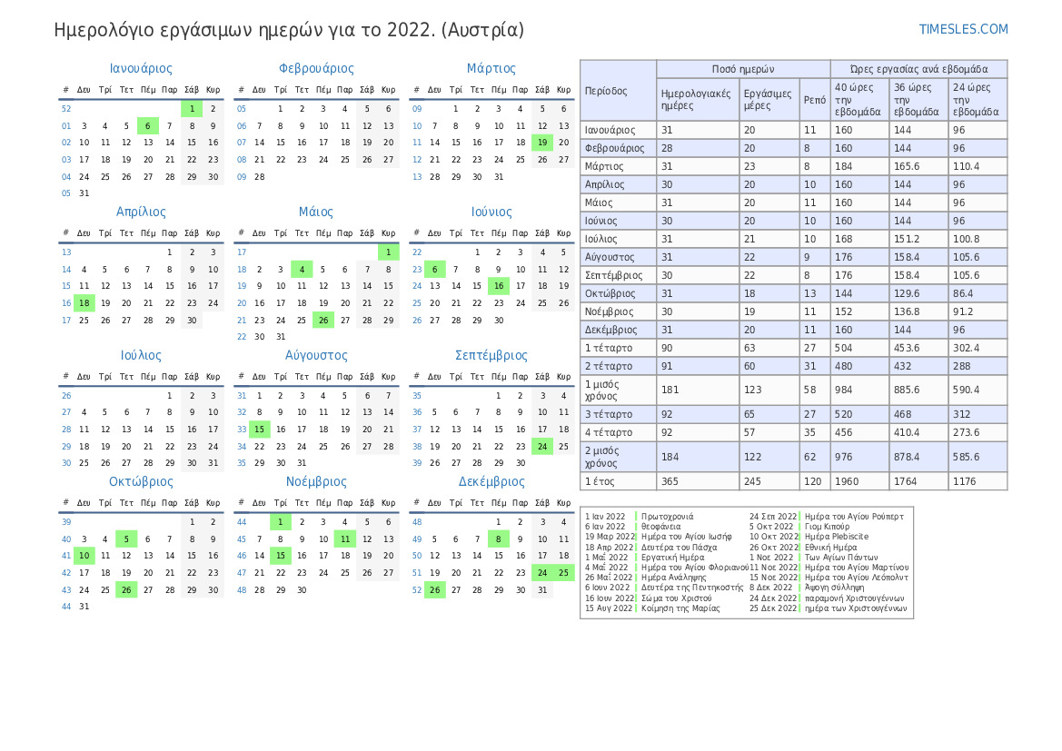 Ημερολόγιο εργάσιμων ημερών με αργίες και σαββατοκύριακα για το 3 τρίμηνο του 2022 για την Αυστρία
