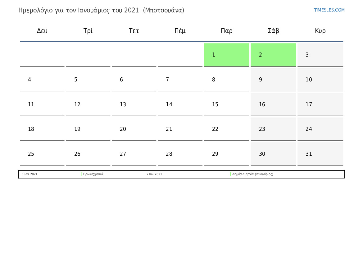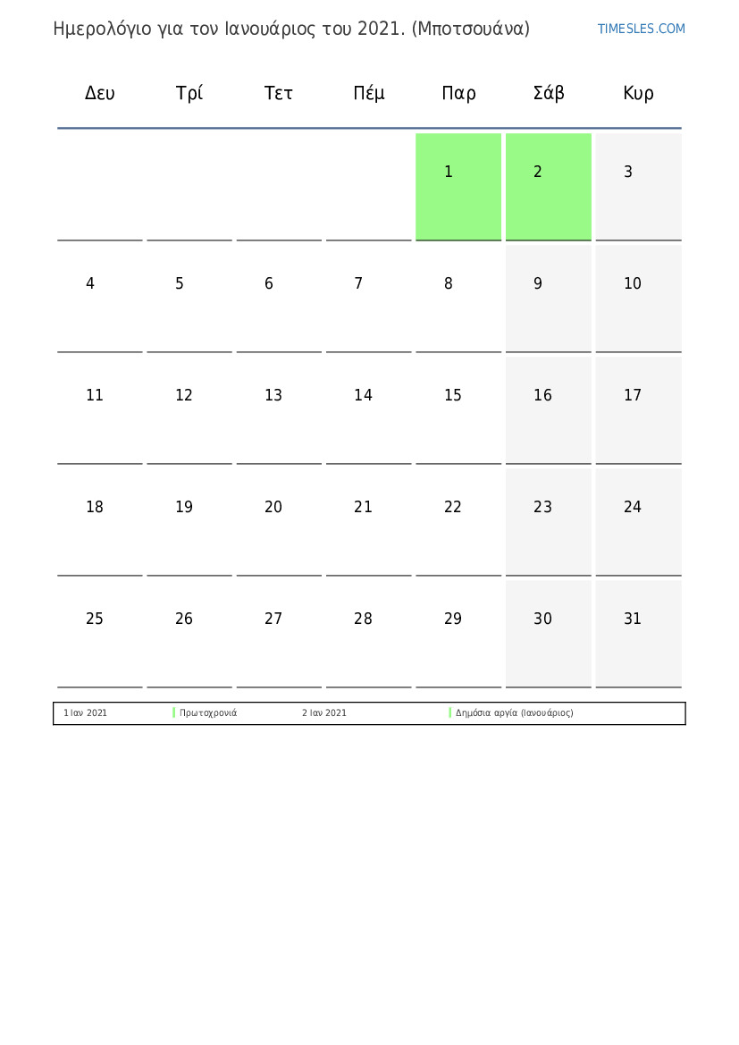 Λήψη και εκτύπωση ημερολογίου PDF με αργίες και σαββατοκύριακα για τον Ιανουάριος του 2021 για την Μποτσουάνα
