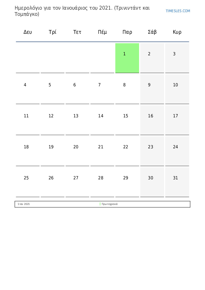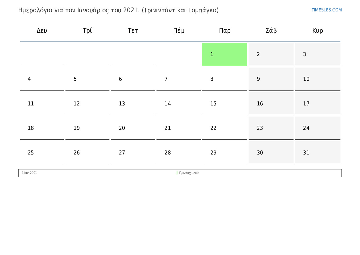 Ο μήνας Ιανουάριος περιέχει 31 ημέρες. Πρόκειται για 1 του 2021. Περίοδος του έτους: χειμώνας. Ο μήνας Ιανουάριος ξεκινά την Παρασκευή και τελειώνει την Κυριακή. Τον Ιανουάριος του 2021, στο Τρινιντάντ και Τομπάγκο υπάρχουν 1 διακοπές και ημέρα αδείας.