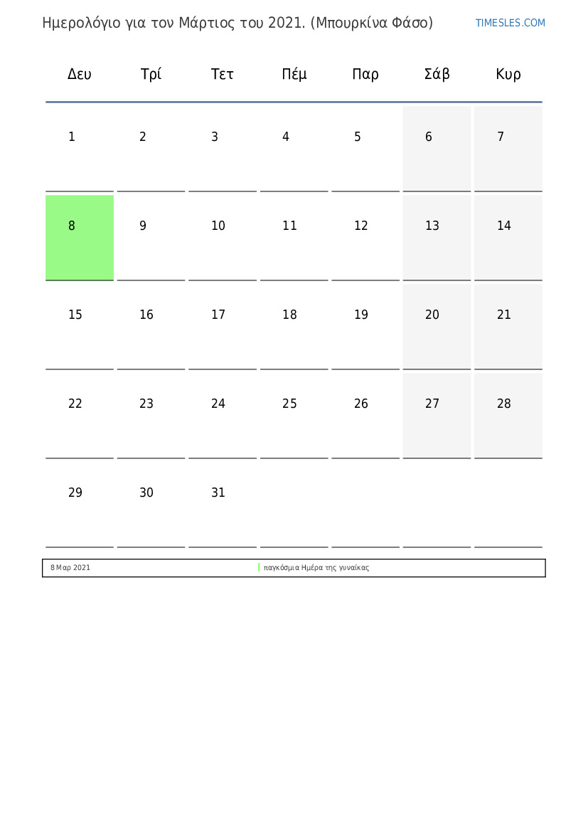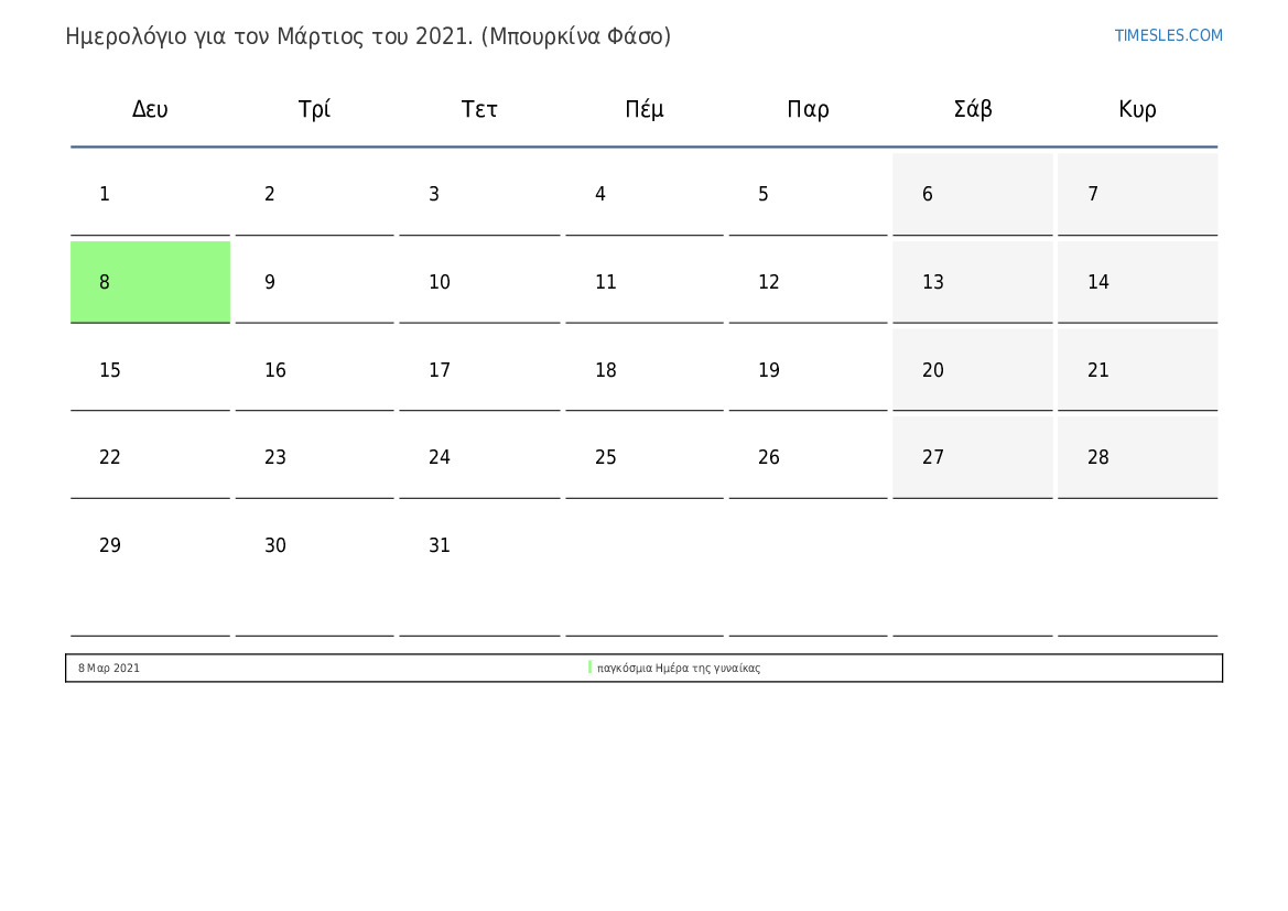 Ημερολόγιο αργιών και Σαββατοκύριακων για το Μάρτιος του 2021 για την Μπουρκίνα Φάσο