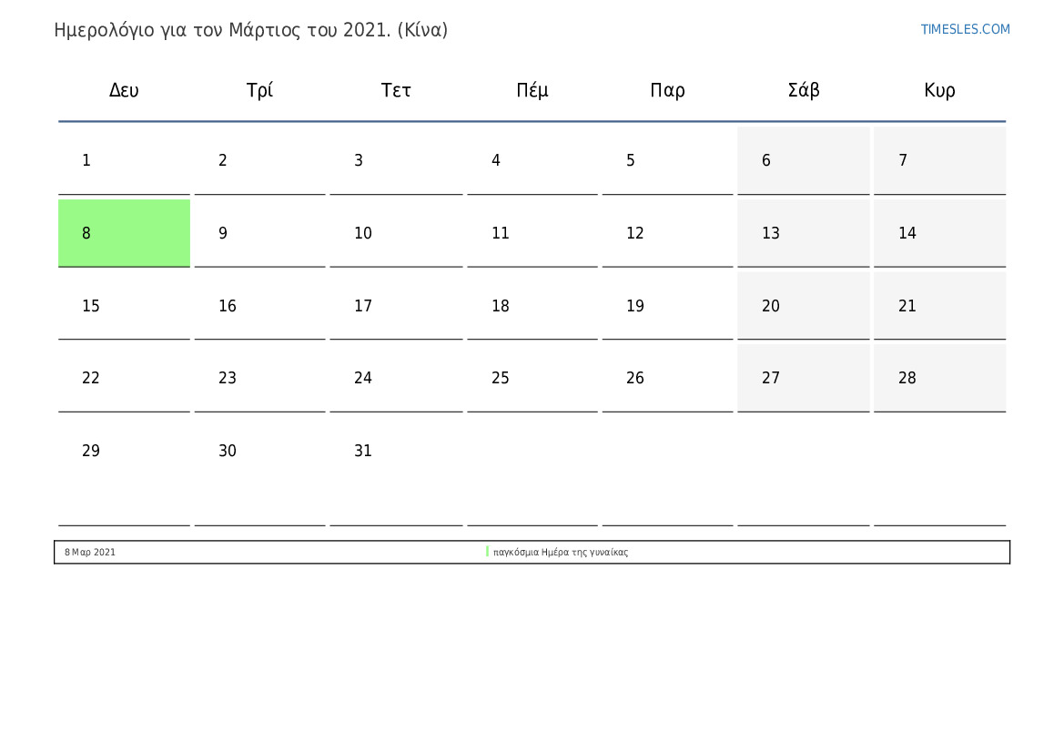 Λήψη και εκτύπωση ημερολογίου PDF με αργίες και σαββατοκύριακα για τον Μάρτιος του 2021 για την Κίνα