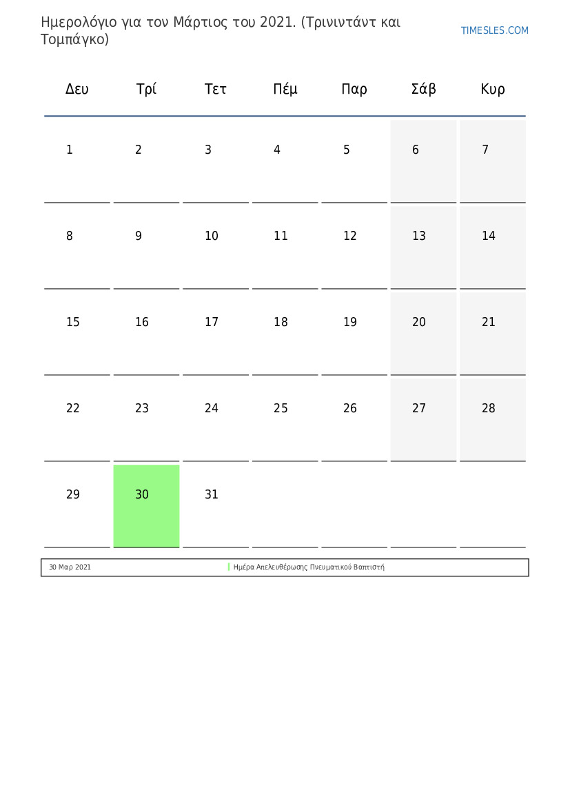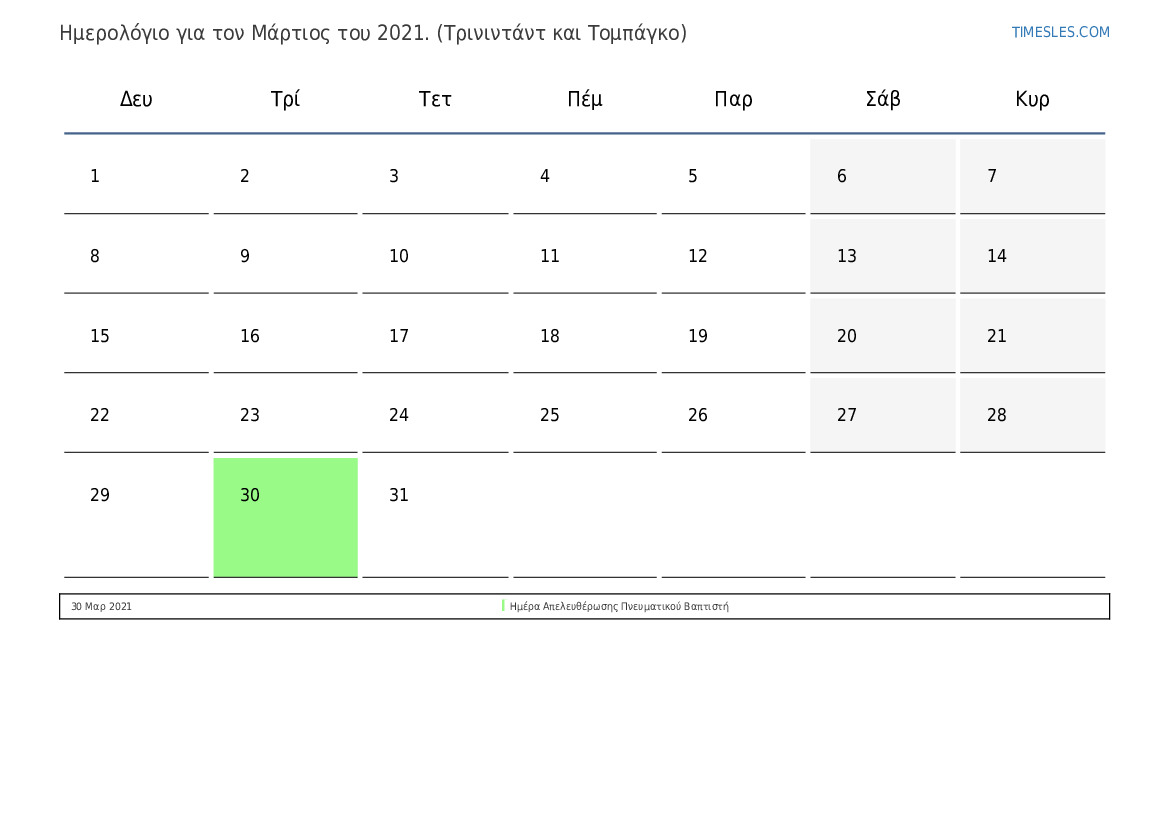 Ημερολόγιο Μάρτιος 2021 για το Τρινιντάντ και Τομπάγκο