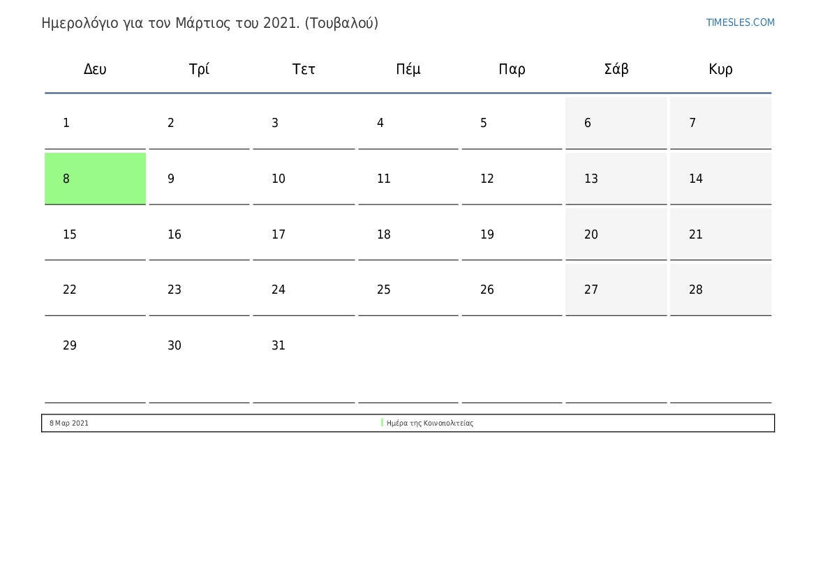 Ημερολόγιο Μάρτιος 2021 για το Τουβαλού