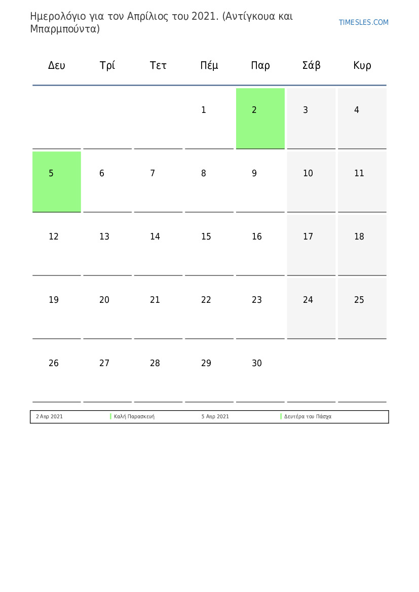 Ημερολόγιο Απρίλιος 2021 για Αντίγκουα και Μπαρμπούντα