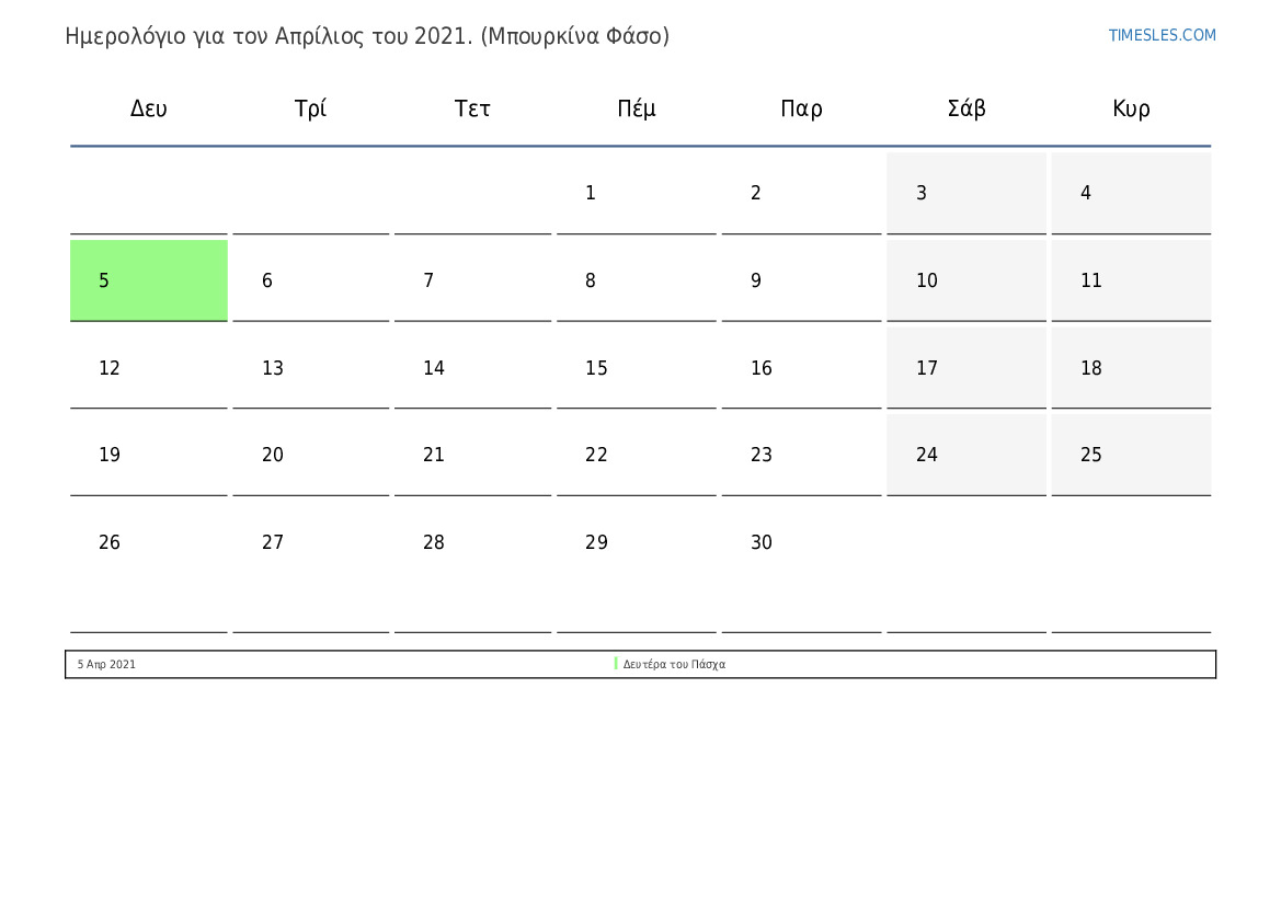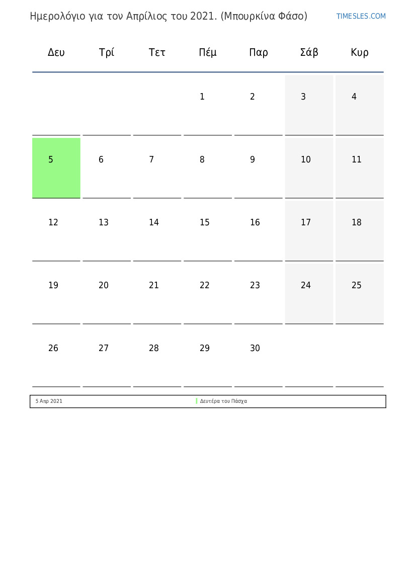 Ημερολόγιο αργιών και Σαββατοκύριακων για το Απρίλιος του 2021 για την Μπουρκίνα Φάσο