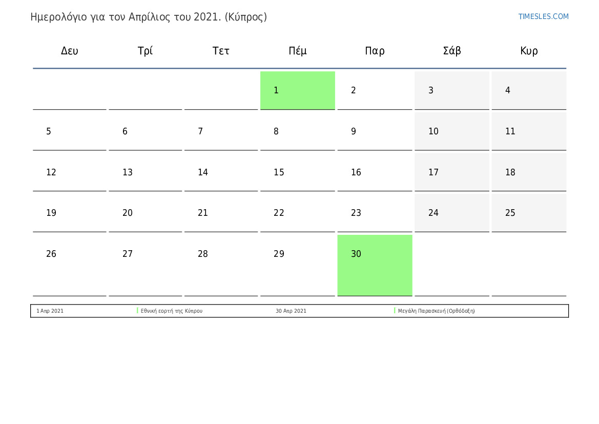Ημερολόγιο αργιών και Σαββατοκύριακων για το Απρίλιος του 2021 για την Κύπρο
