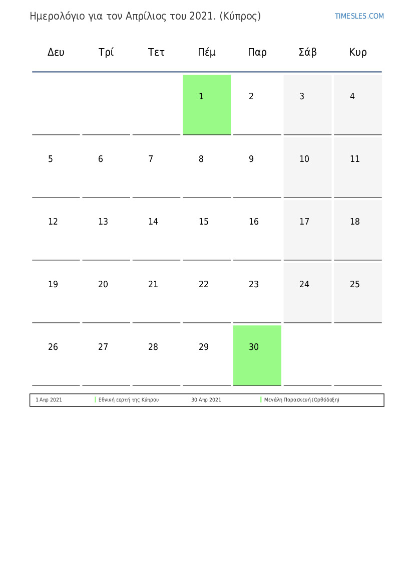 Λήψη και εκτύπωση ημερολογίου PDF με αργίες και σαββατοκύριακα για τον Απρίλιος του 2021 για την Κύπρο