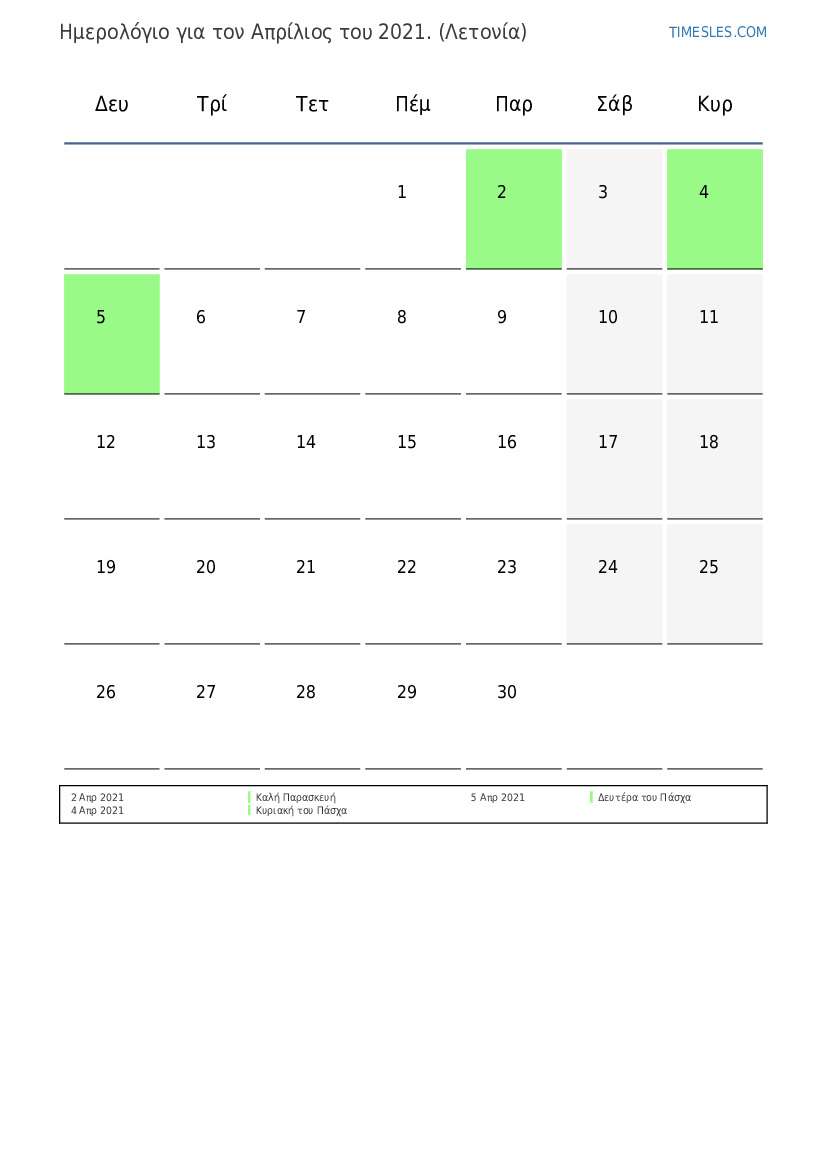Ημερολόγιο Απρίλιος 2021 για τη Λετονία
