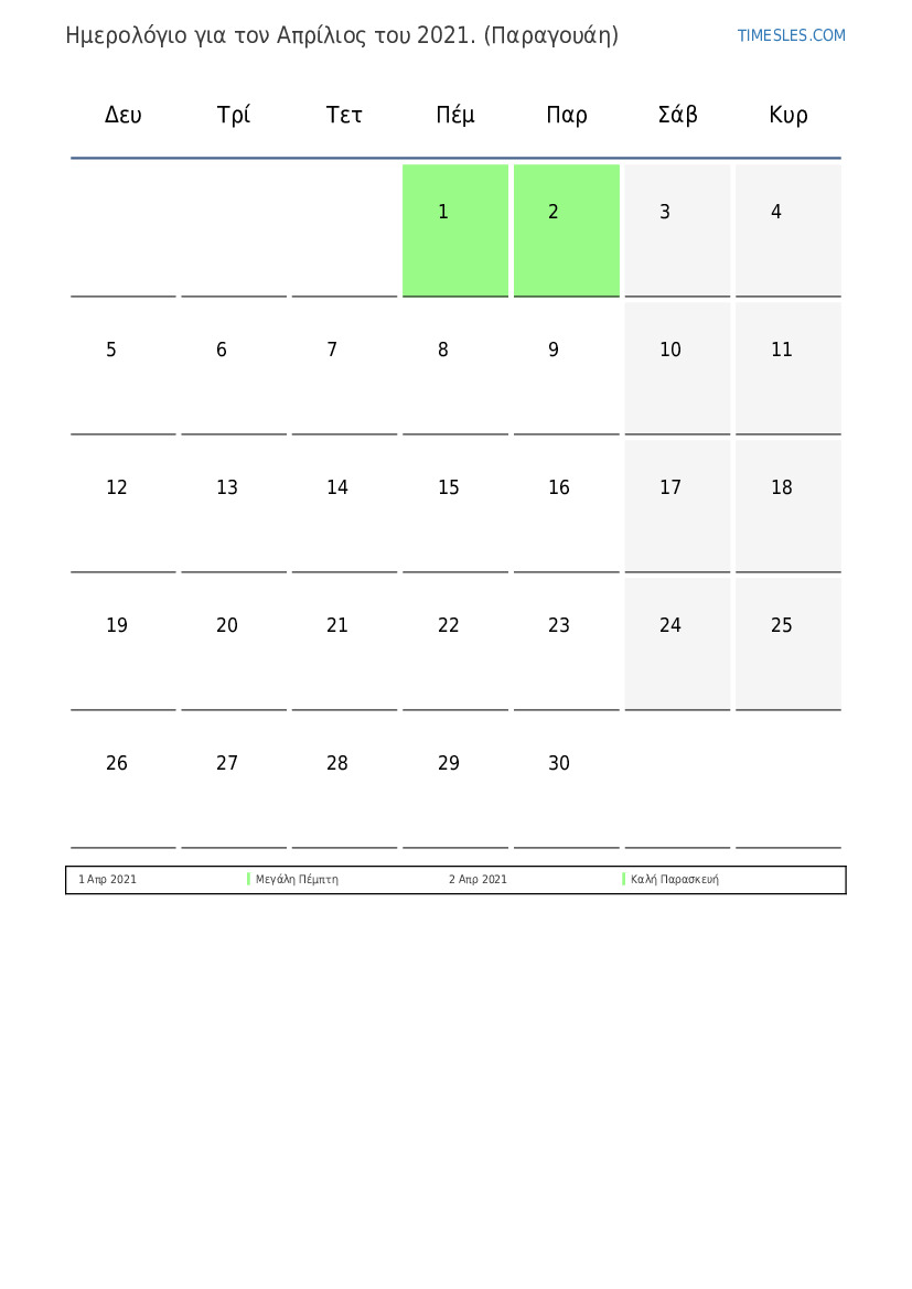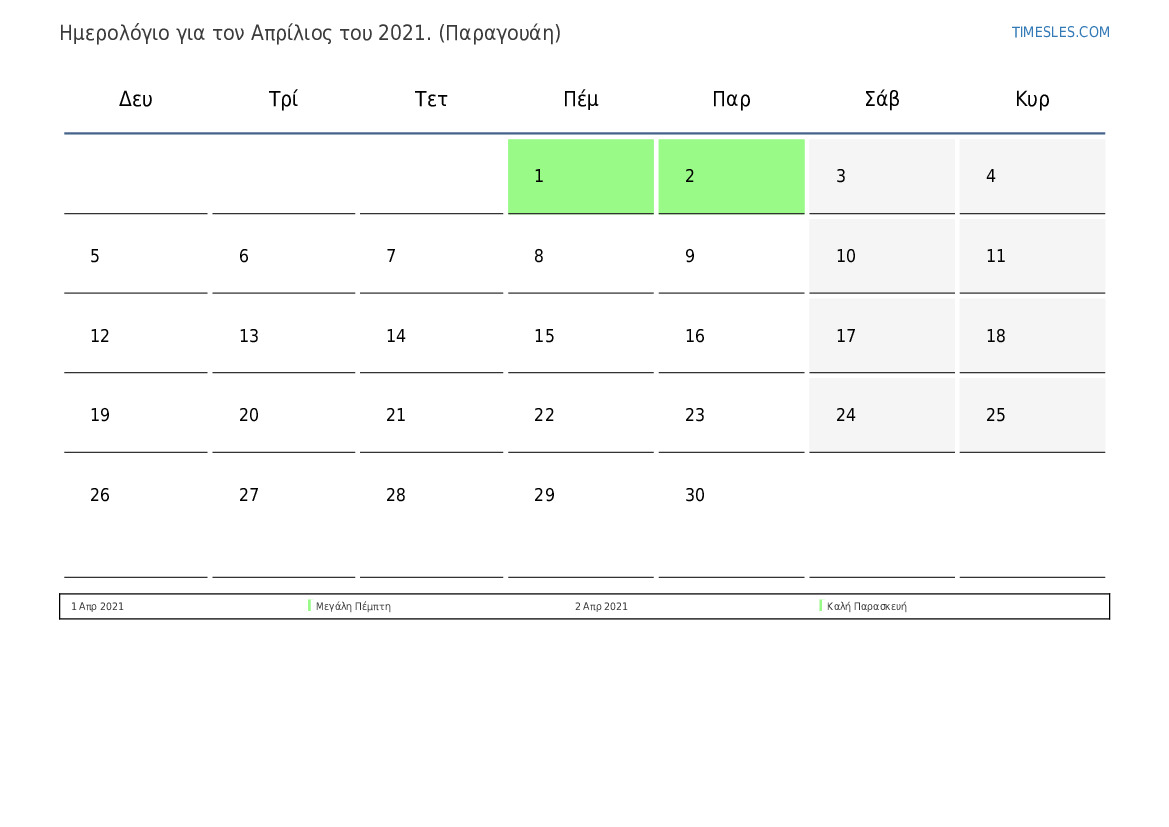 Ημερολόγιο Απρίλιος 2021 για την Παραγουάη