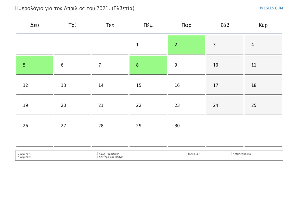Ημερολόγιο αργιών και Σαββατοκύριακων για το Απρίλιος του 2021 για την Ελβετία