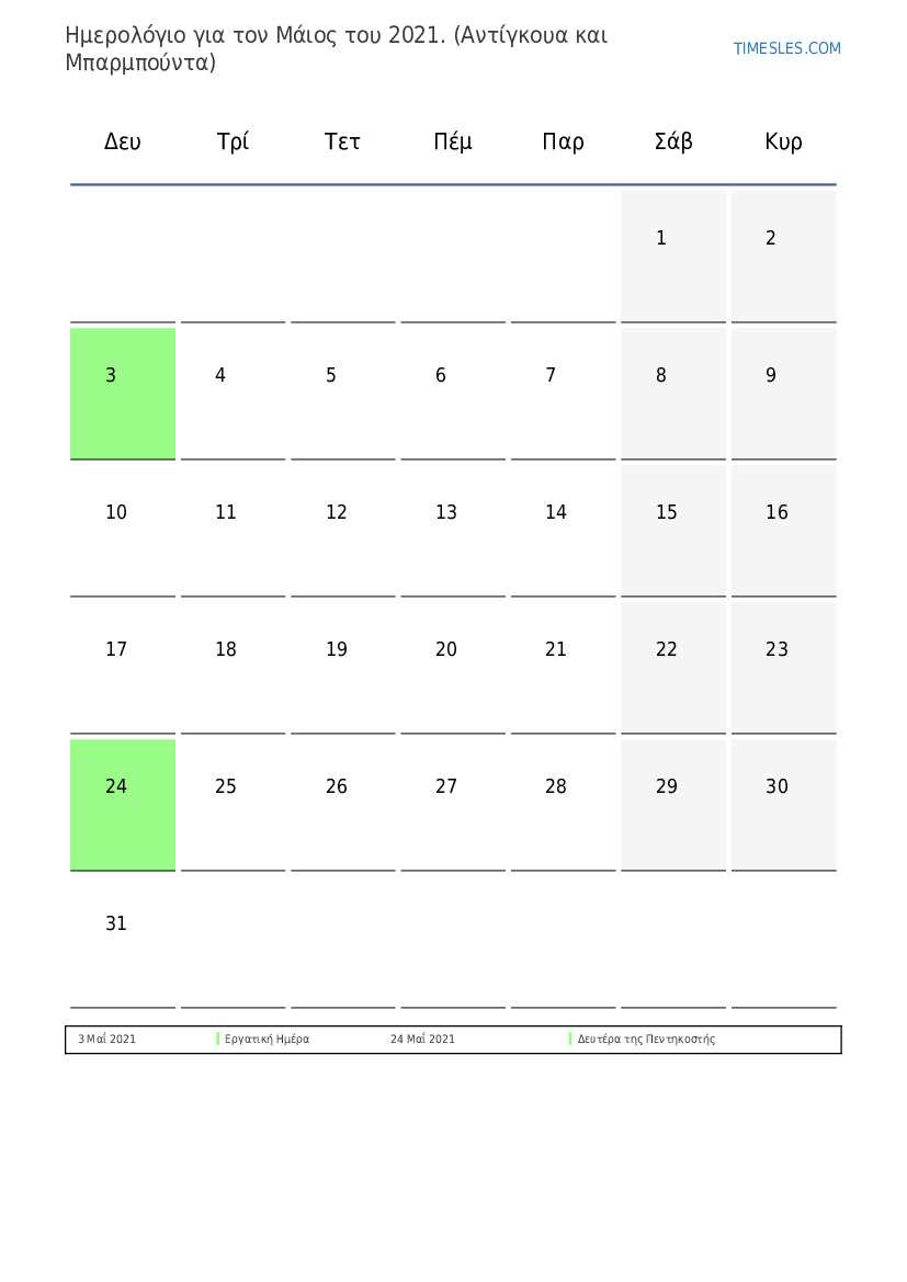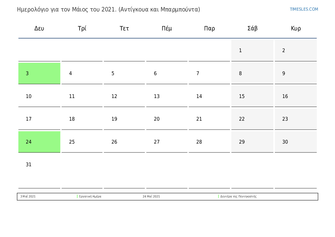 Ημερολόγιο Μάιος 2021 για Αντίγκουα και Μπαρμπούντα