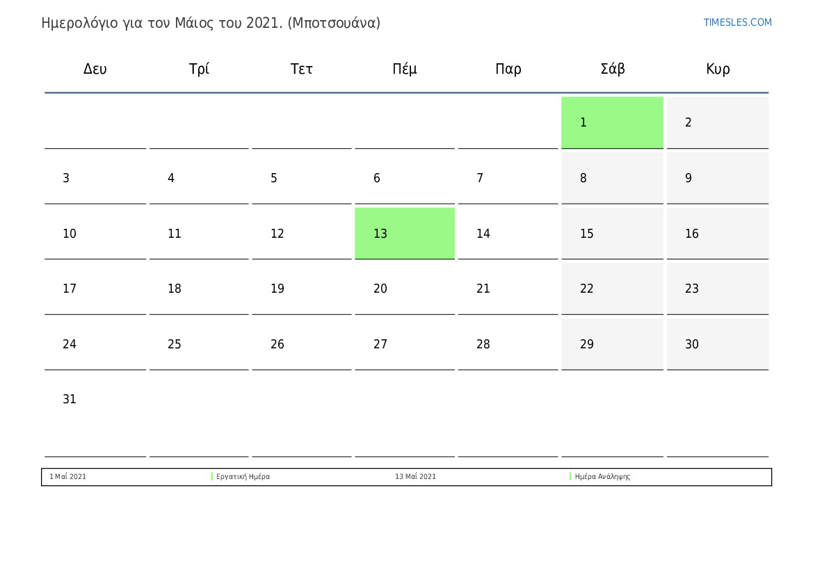 Λήψη και εκτύπωση ημερολογίου PDF με αργίες και σαββατοκύριακα για τον Μάιος του 2021 για την Μποτσουάνα