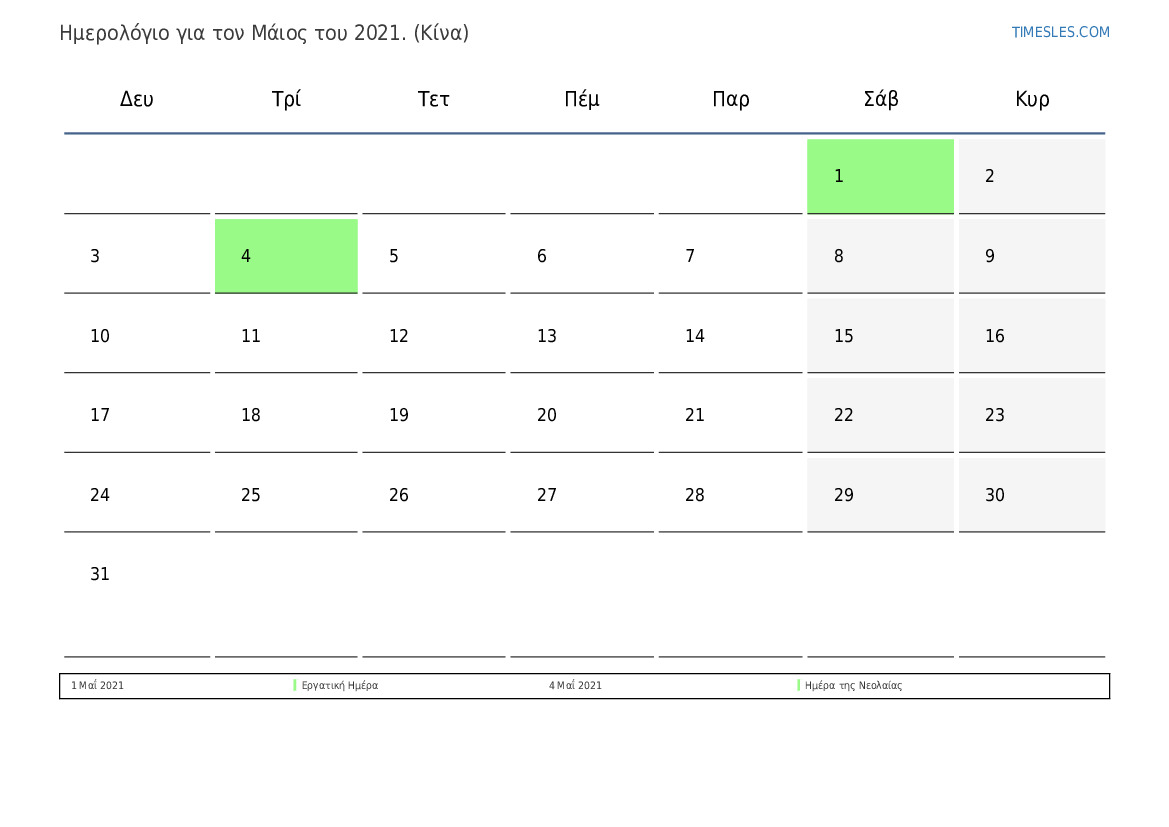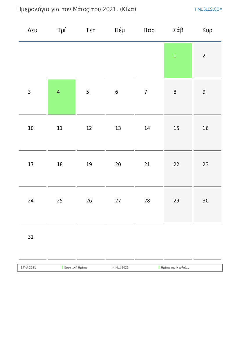 Ημερολόγιο αργιών και Σαββατοκύριακων για το Μάιος του 2021 για την Κίνα