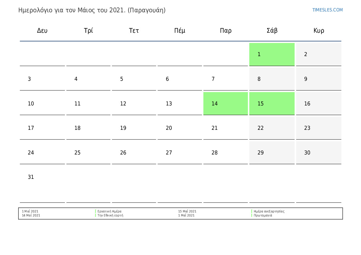 Ημερολόγιο αργιών και Σαββατοκύριακων για το Μάιος του 2021 για την Παραγουάη