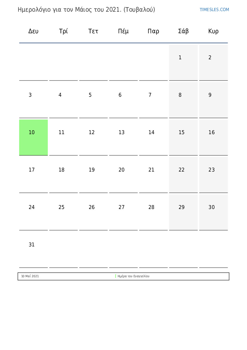 Λήψη και εκτύπωση ημερολογίου PDF με αργίες και σαββατοκύριακα για τον Μάιος του 2021 για το Τουβαλού