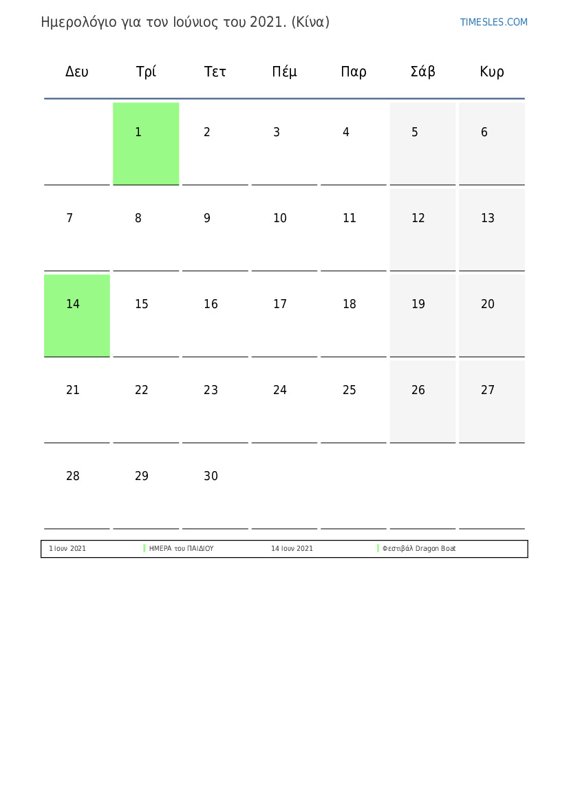 Ημερολόγιο αργιών και Σαββατοκύριακων για το Ιούνιος του 2021 για την Κίνα