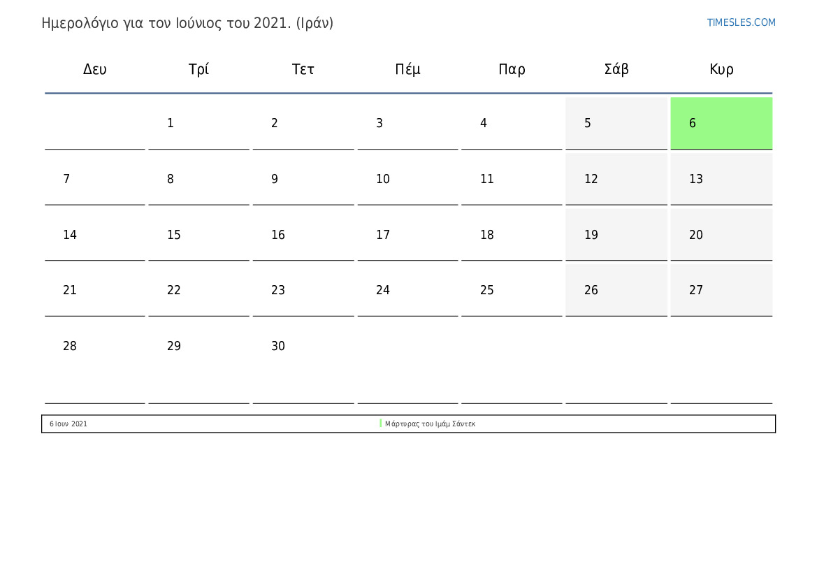 Ημερολόγιο αργιών και Σαββατοκύριακων για το Ιούνιος του 2021 για το Ιράν