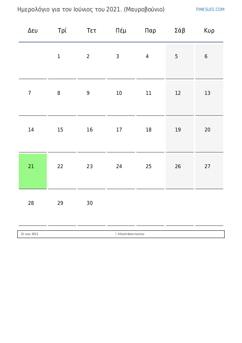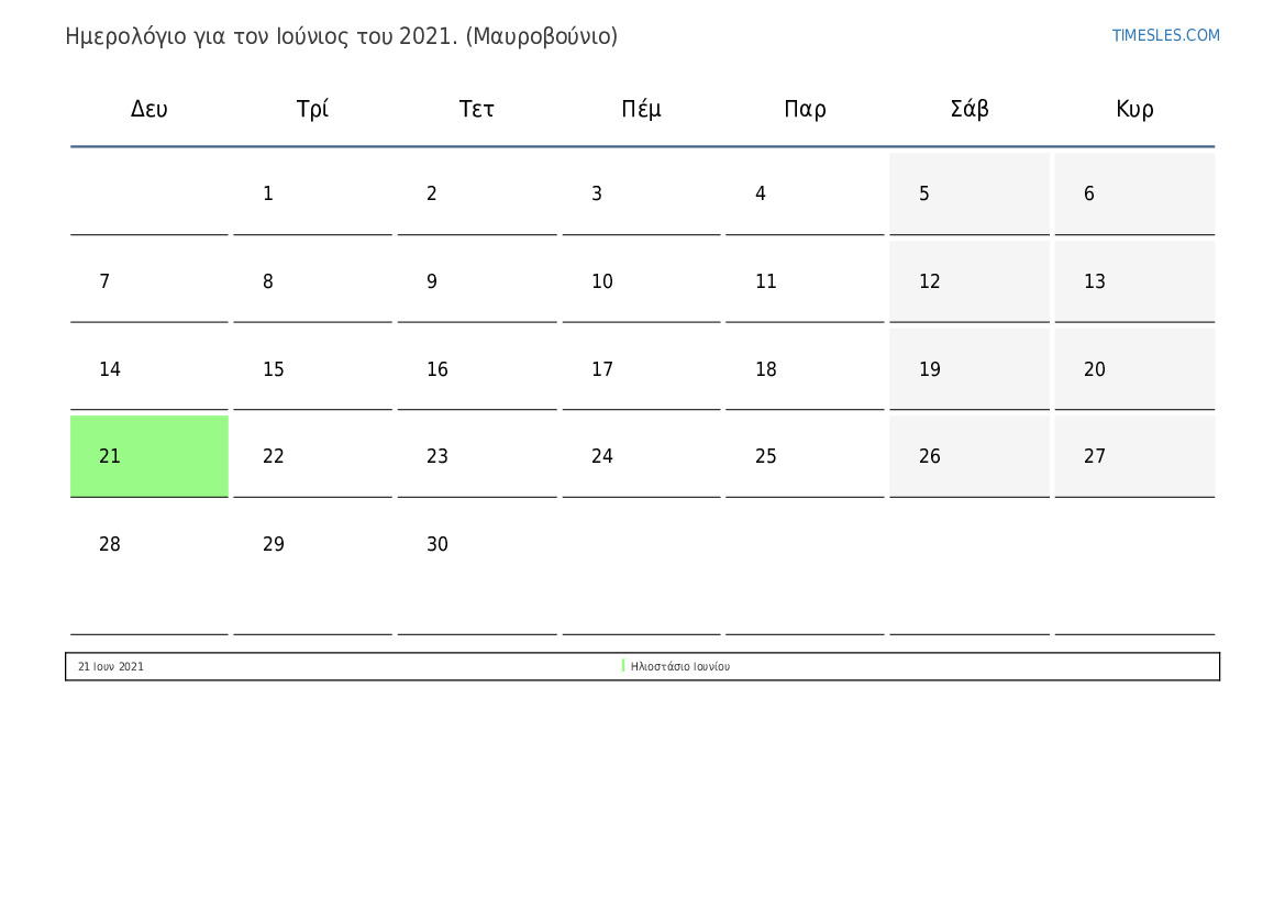 Λήψη και εκτύπωση ημερολογίου PDF με αργίες και σαββατοκύριακα για τον Ιούνιος του 2021 για το Μαυροβούνιο