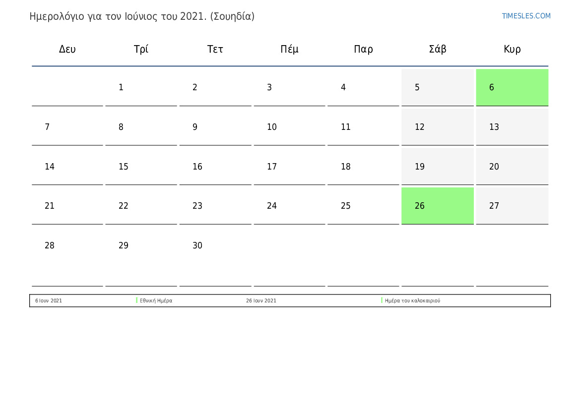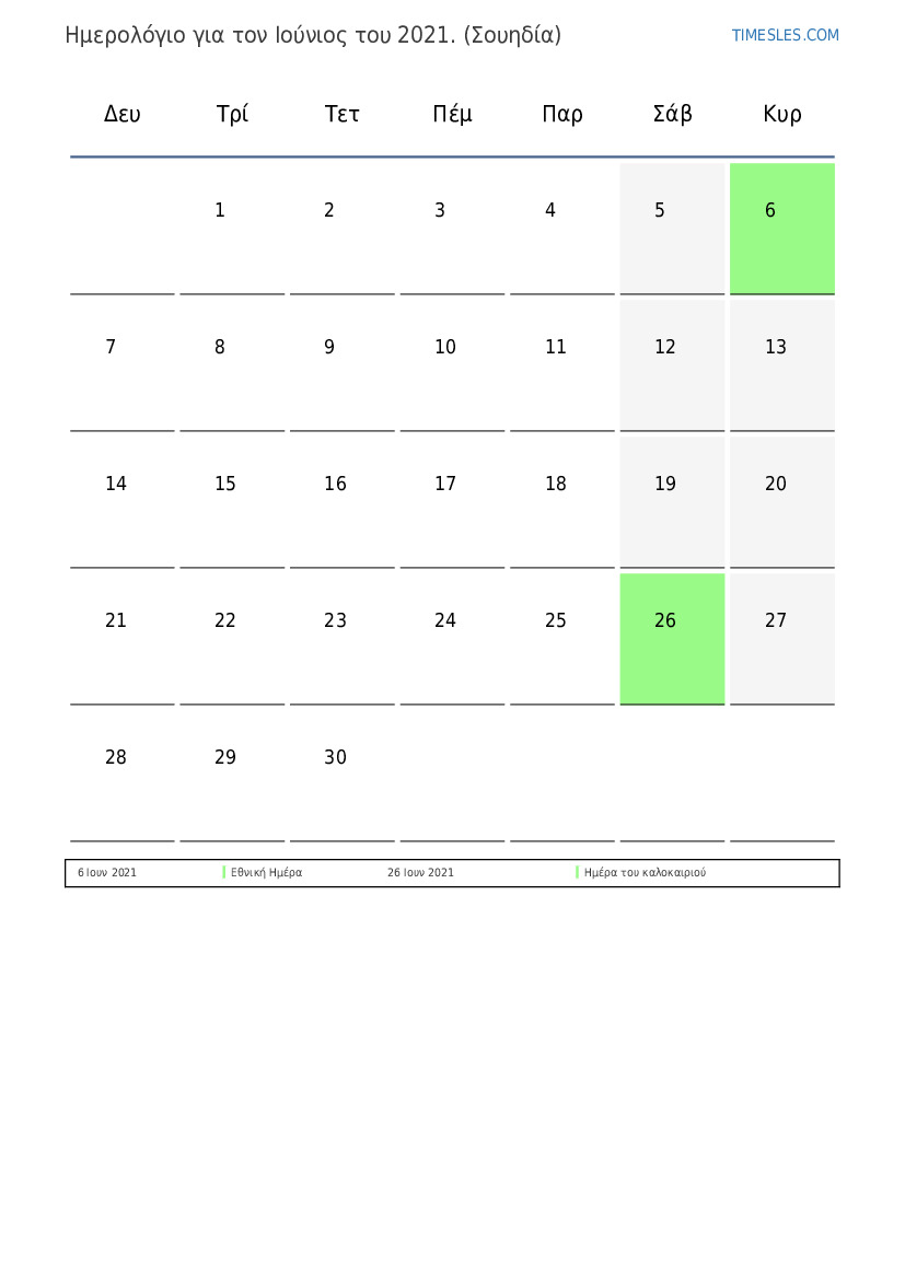 Λήψη και εκτύπωση ημερολογίου PDF με αργίες και σαββατοκύριακα για τον Ιούνιος του 2021 για τη Σουηδία