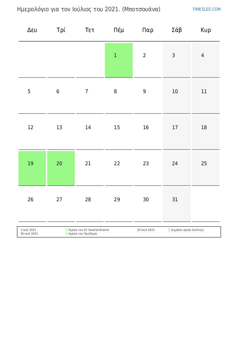 Λήψη και εκτύπωση ημερολογίου PDF με αργίες και σαββατοκύριακα για τον Ιούλιος του 2021 για την Μποτσουάνα
