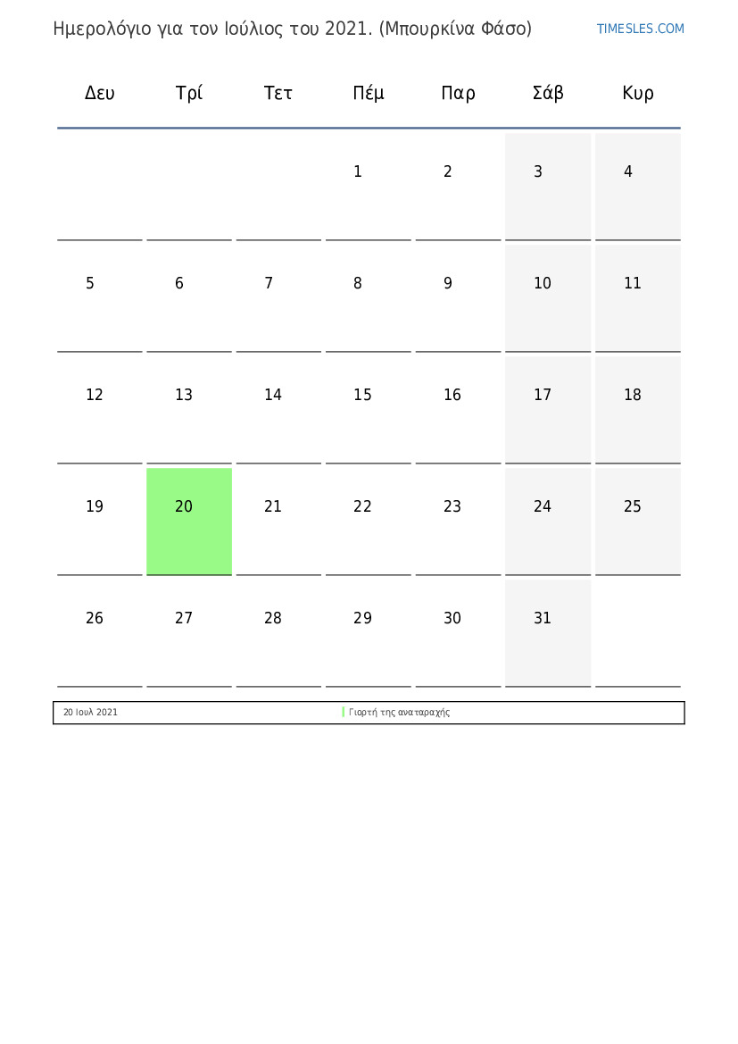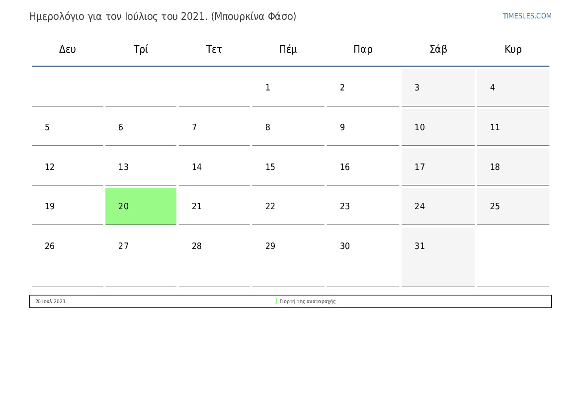 Λήψη και εκτύπωση ημερολογίου PDF με αργίες και σαββατοκύριακα για τον Ιούλιος του 2021 για την Μπουρκίνα Φάσο