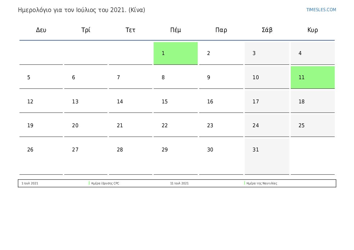 Λήψη και εκτύπωση ημερολογίου PDF με αργίες και σαββατοκύριακα για τον Ιούλιος του 2021 για την Κίνα