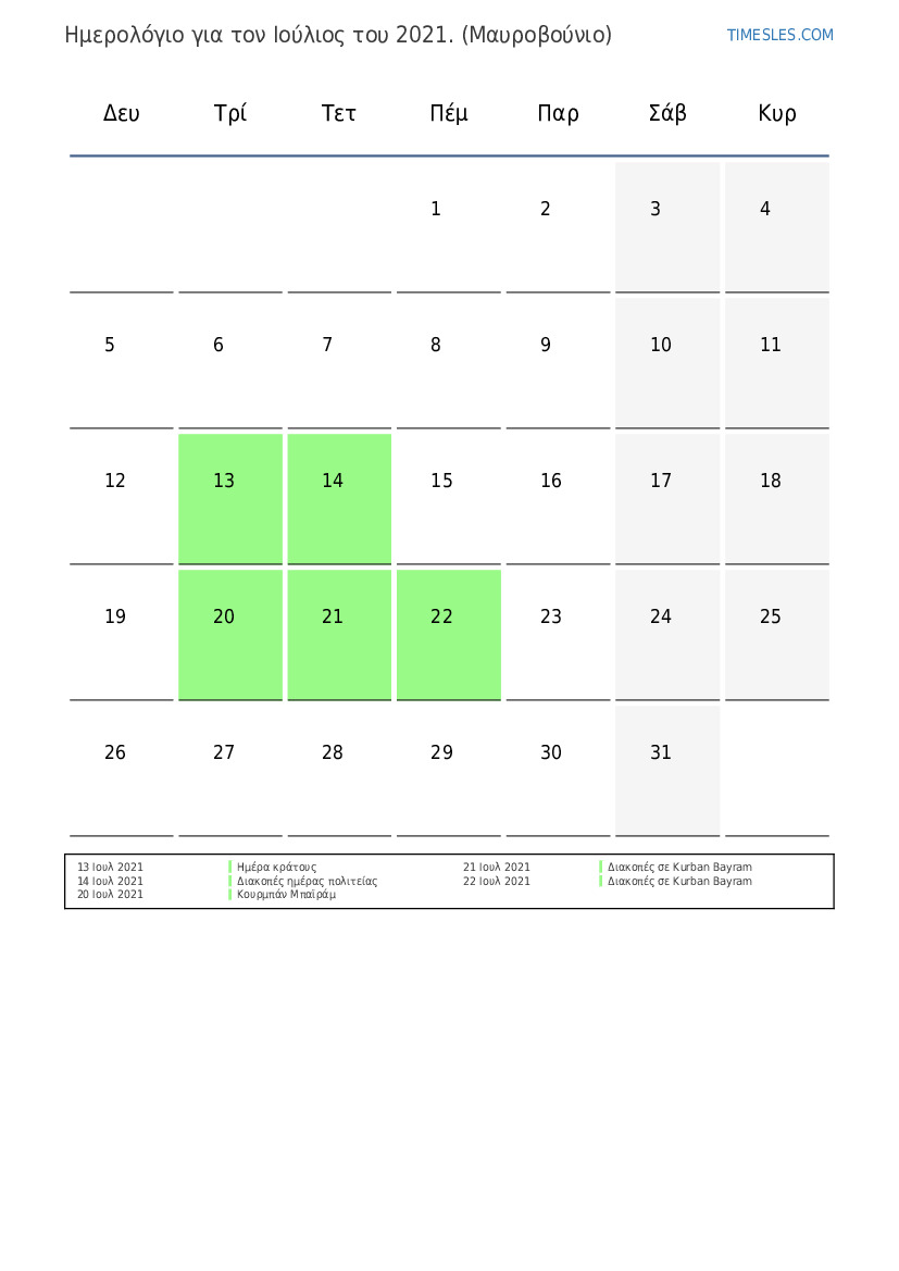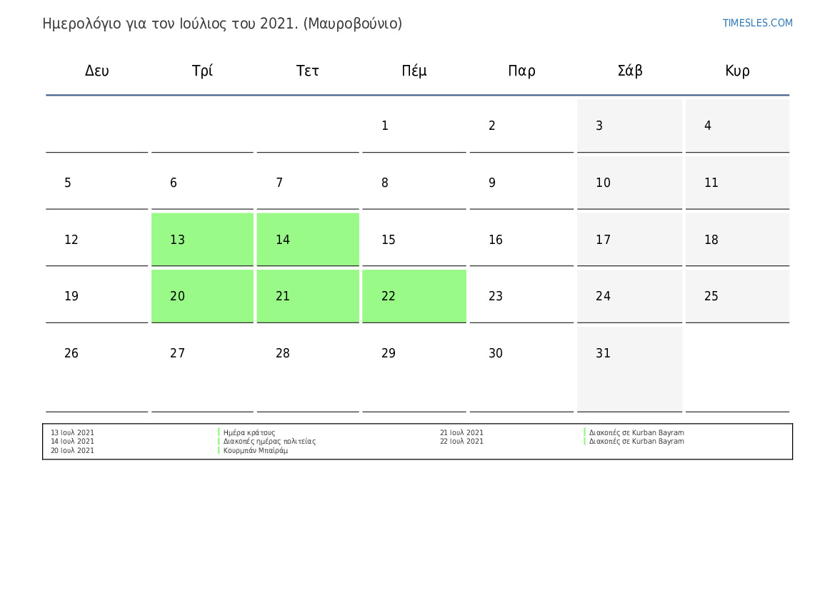 Ημερολόγιο αργιών και Σαββατοκύριακων για το Ιούλιος του 2021 για το Μαυροβούνιο