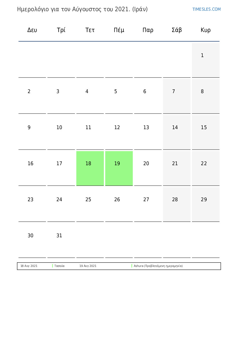 Ημερολόγιο αργιών και Σαββατοκύριακων για το Αύγουστος του 2021 για το Ιράν