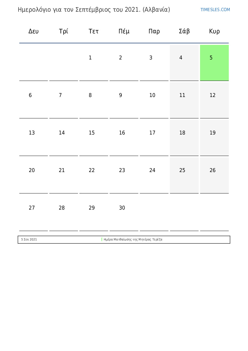 Λήψη και εκτύπωση ημερολογίου PDF με αργίες και σαββατοκύριακα για τον Σεπτέμβριος του 2021 για την Αλβανία
