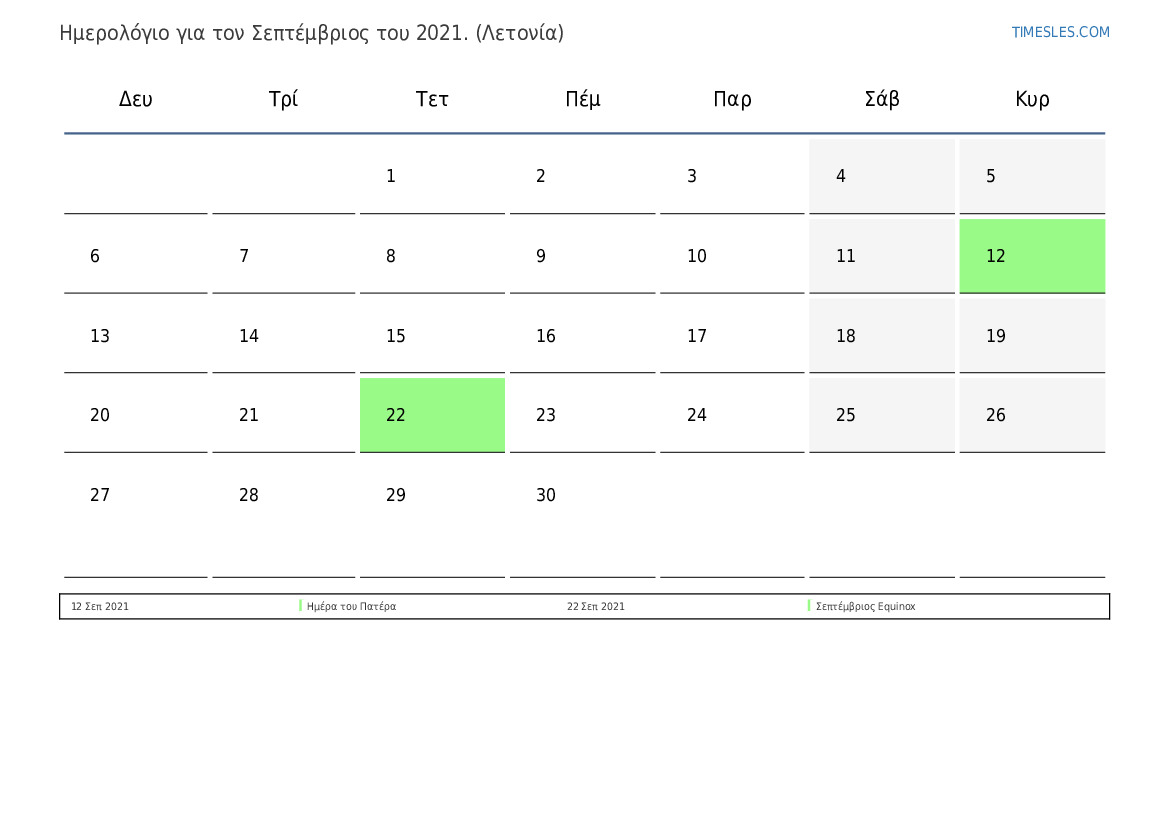 Ημερολόγιο Σεπτέμβριος 2021 για τη Λετονία