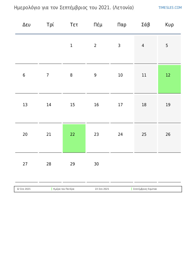 Λήψη και εκτύπωση ημερολογίου PDF με αργίες και σαββατοκύριακα για τον Σεπτέμβριος του 2021 για τη Λετονία
