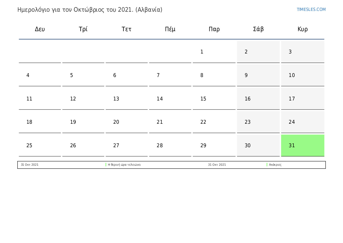 Λήψη και εκτύπωση ημερολογίου PDF με αργίες και σαββατοκύριακα για τον Οκτώβριος του 2021 για την Αλβανία