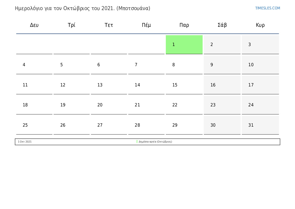 Ημερολόγιο αργιών και Σαββατοκύριακων για το Οκτώβριος του 2021 για την Μποτσουάνα
