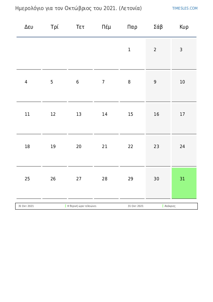 Λήψη και εκτύπωση ημερολογίου PDF με αργίες και σαββατοκύριακα για τον Οκτώβριος του 2021 για τη Λετονία