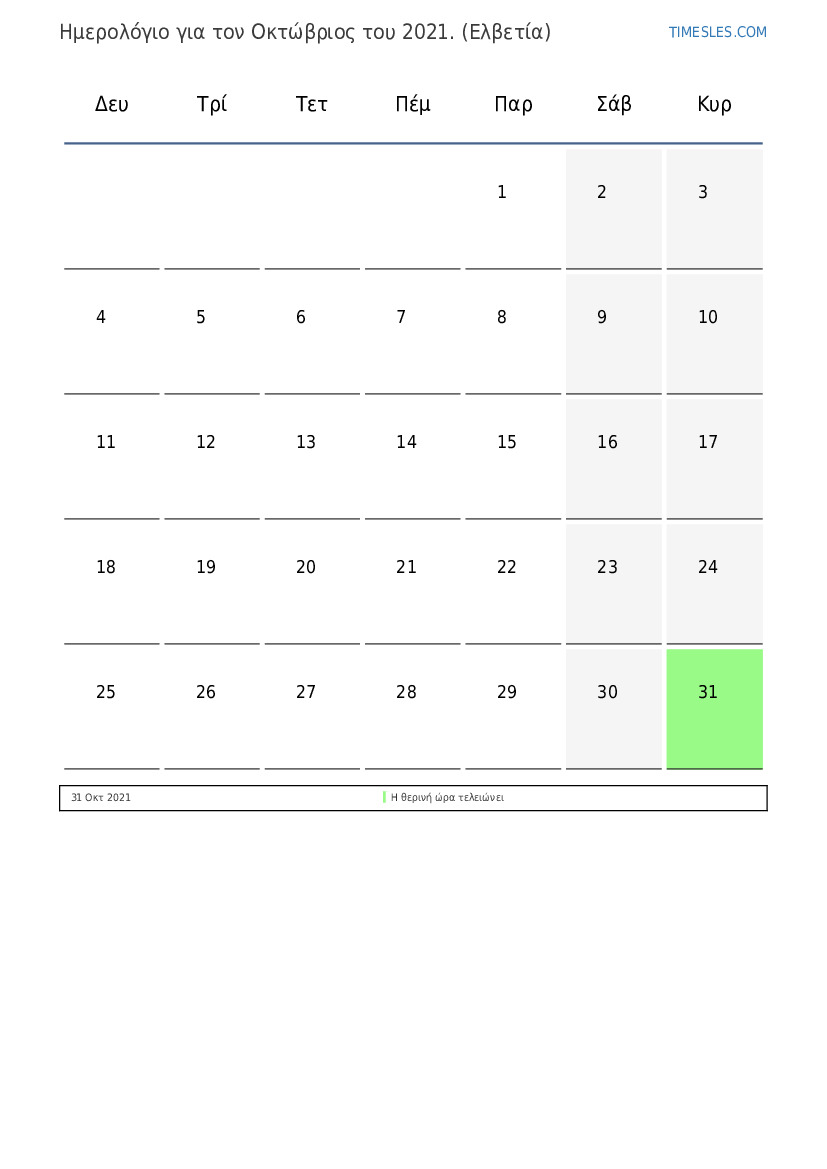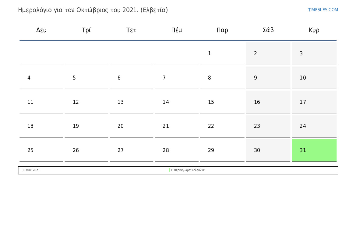 Λήψη και εκτύπωση ημερολογίου PDF με αργίες και σαββατοκύριακα για τον Οκτώβριος του 2021 για την Ελβετία