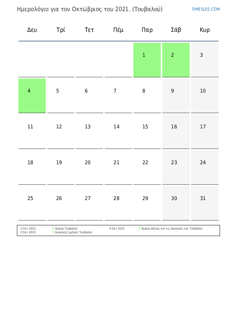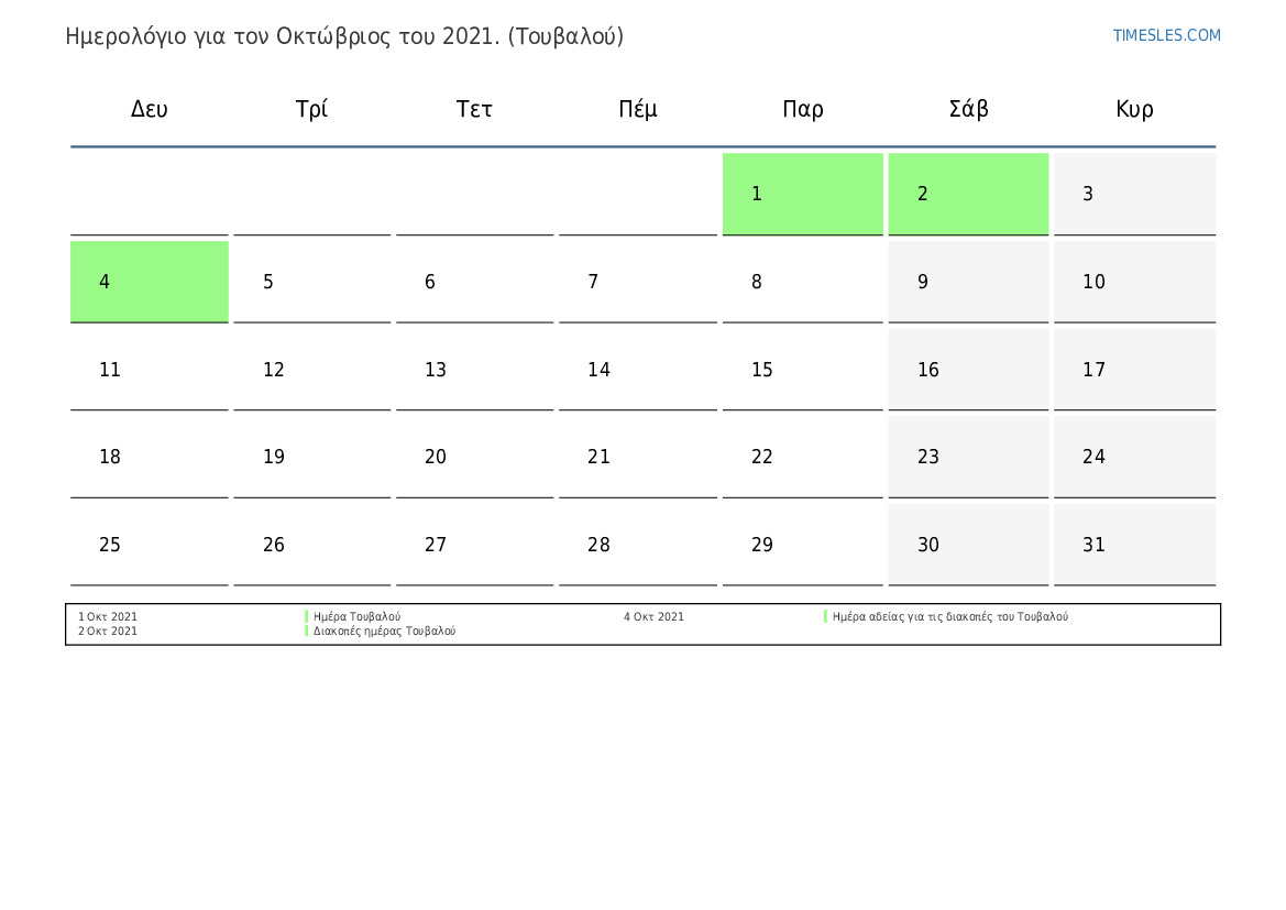 Ημερολόγιο αργιών και Σαββατοκύριακων για το Οκτώβριος του 2021 για το Τουβαλού