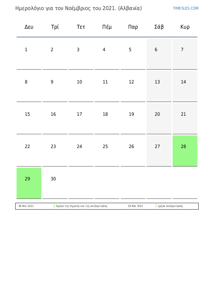 Ημερολόγιο αργιών και Σαββατοκύριακων για το Νοέμβριος του 2021 για την Αλβανία