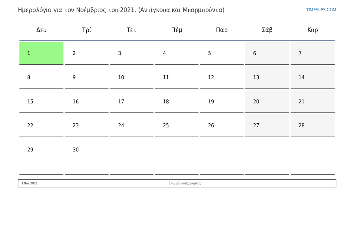 Ημερολόγιο Νοέμβριος 2021 για Αντίγκουα και Μπαρμπούντα