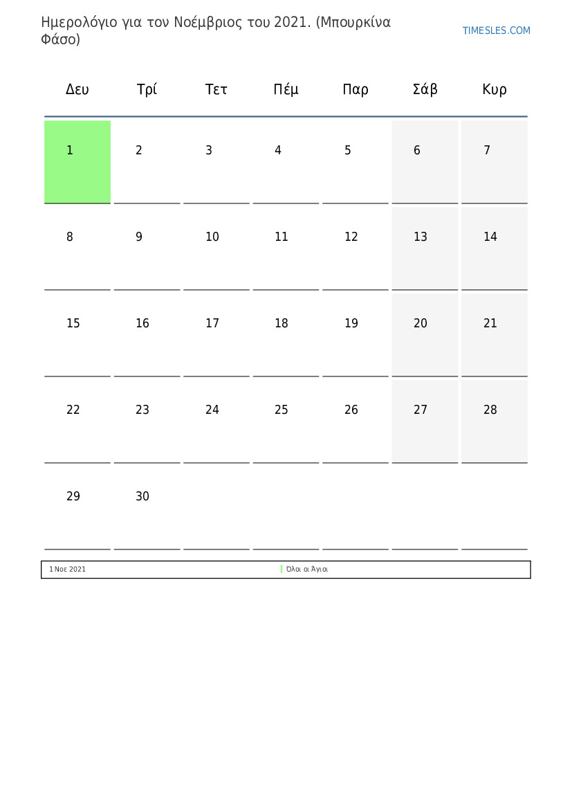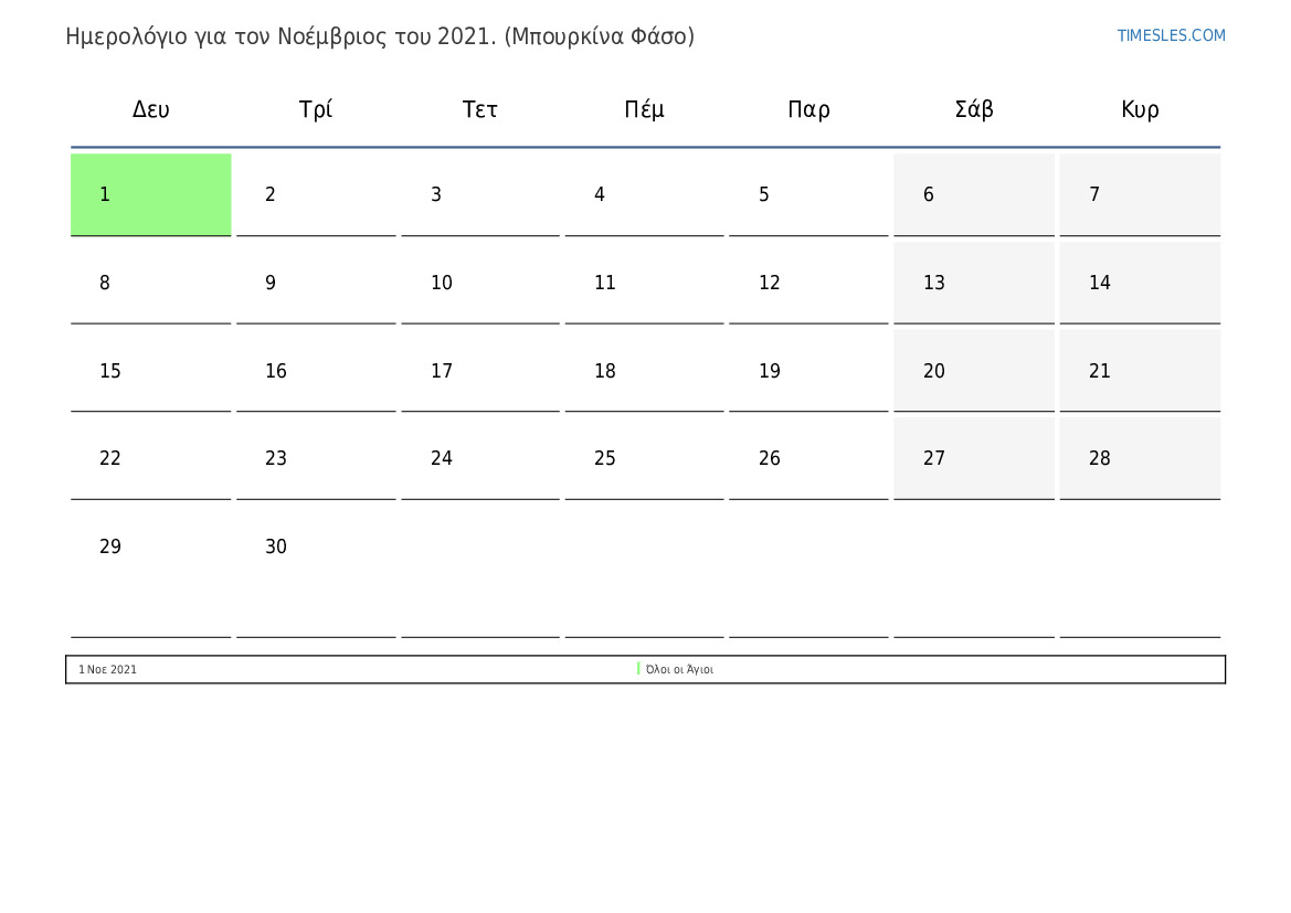 Λήψη και εκτύπωση ημερολογίου PDF με αργίες και σαββατοκύριακα για τον Νοέμβριος του 2021 για την Μπουρκίνα Φάσο