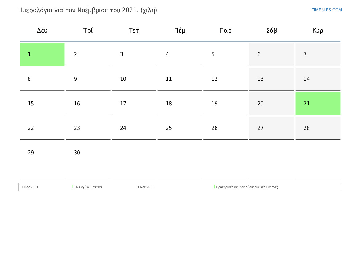 Λήψη και εκτύπωση ημερολογίου PDF με αργίες και σαββατοκύριακα για τον Νοέμβριος του 2021 για τη Χιλή