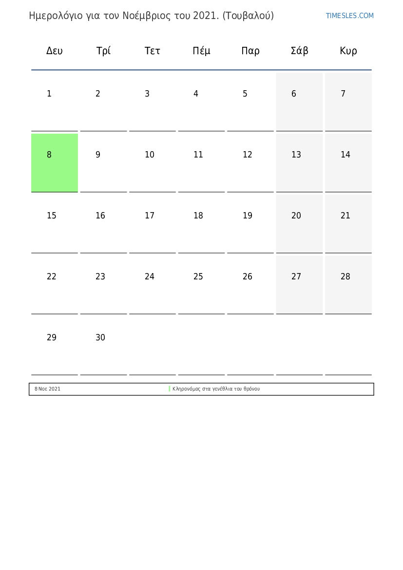 Ημερολόγιο αργιών και Σαββατοκύριακων για το Νοέμβριος του 2021 για το Τουβαλού